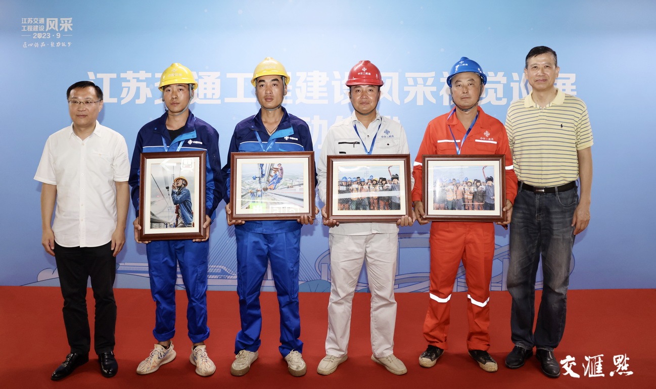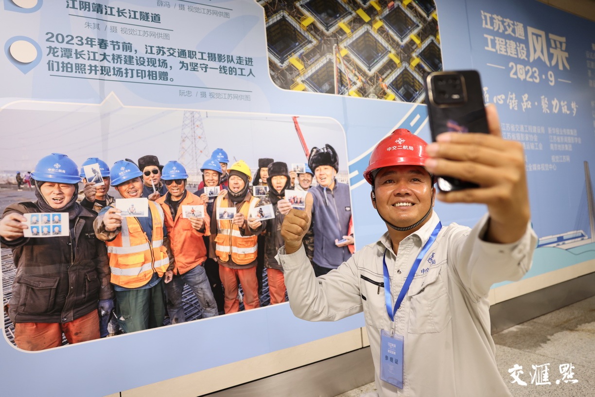 在2023江苏交通工程建设风采视觉巡展现场,摄影师与交通工程一线建设者开心合影。