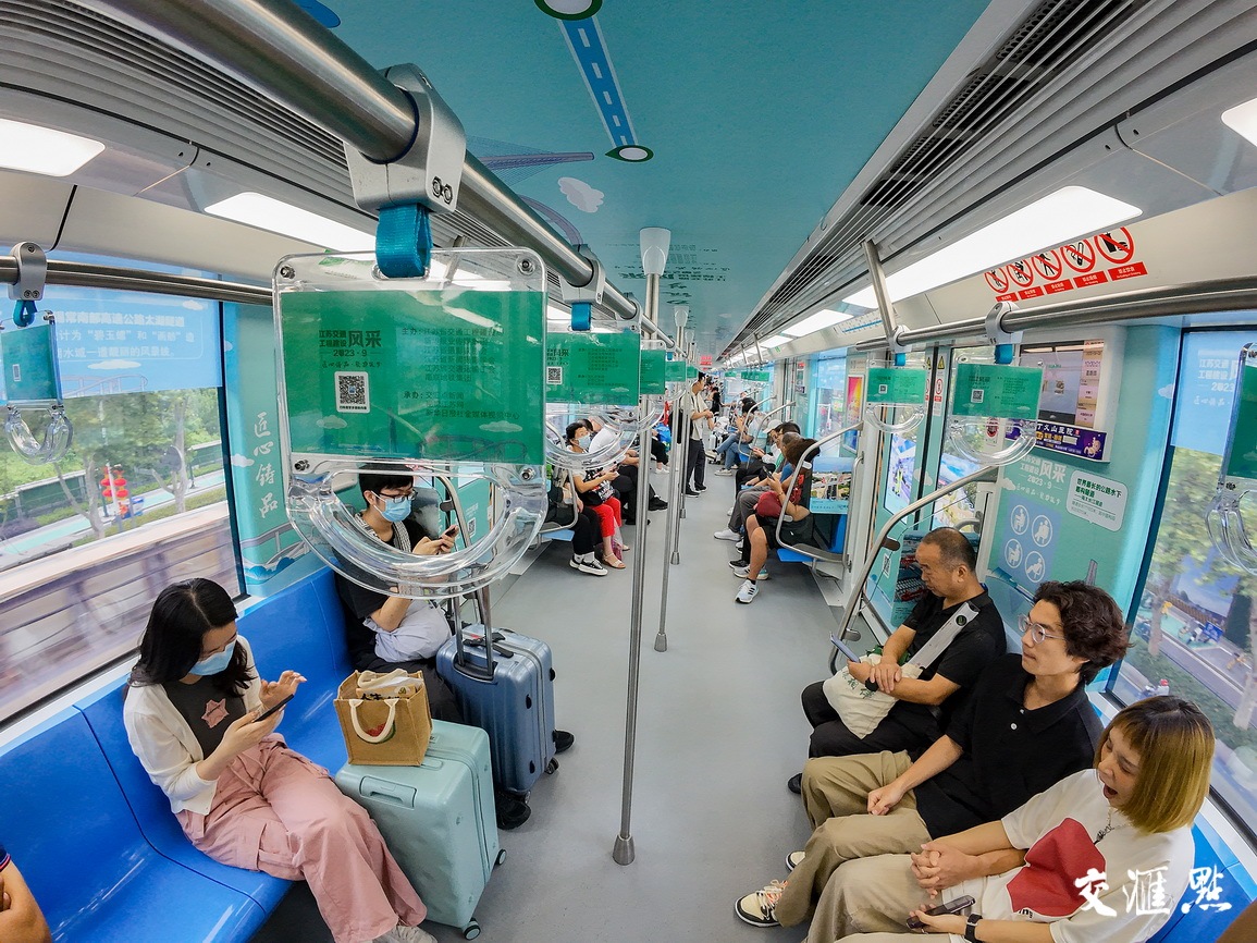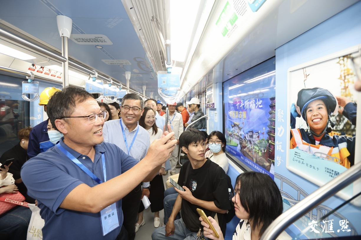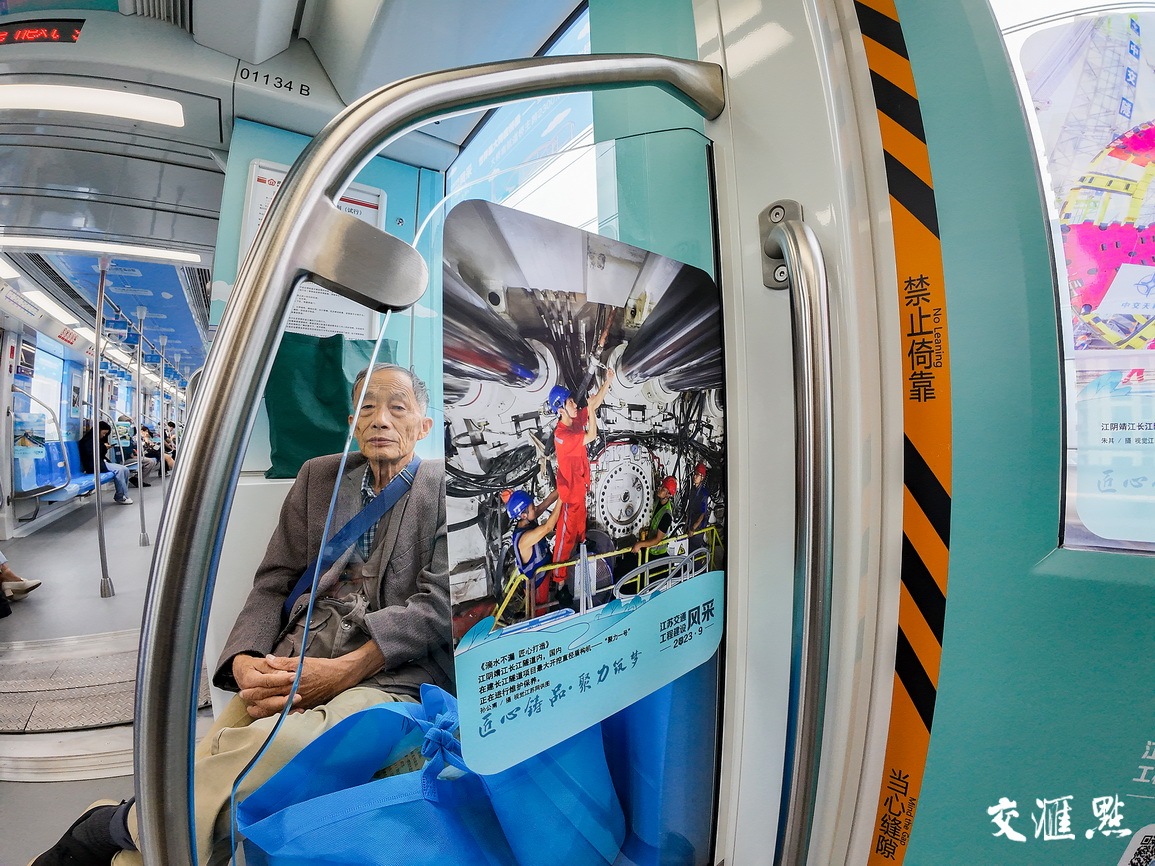 1号线是南京地铁客流量最大的线路。28日10时许,编号为133/134、开往南京药科大学方向的1号线列车驶进鼓楼站。车厢内,玻璃贴、侧椅贴、车门贴、车厢看板以及车身被整体打包设计,嵌入了276张精选的交通照片,向市民充分展示了江苏交通工程的宏伟气魄和交通建设者的风采。在这趟视觉品牌专列的车厢顶部、车头车尾以及照片间的空隙,对江苏交通工程建设近年来创下的多个“世界首创”“世界第一”也做了展示,图文并茂地向民众科普交通工程建设知识。乘客还可通过扫描车厢内“交汇点新闻”的二维码浏览线上展览,并由此拉开共庆交汇点新闻客户端上线八周年的大幕。