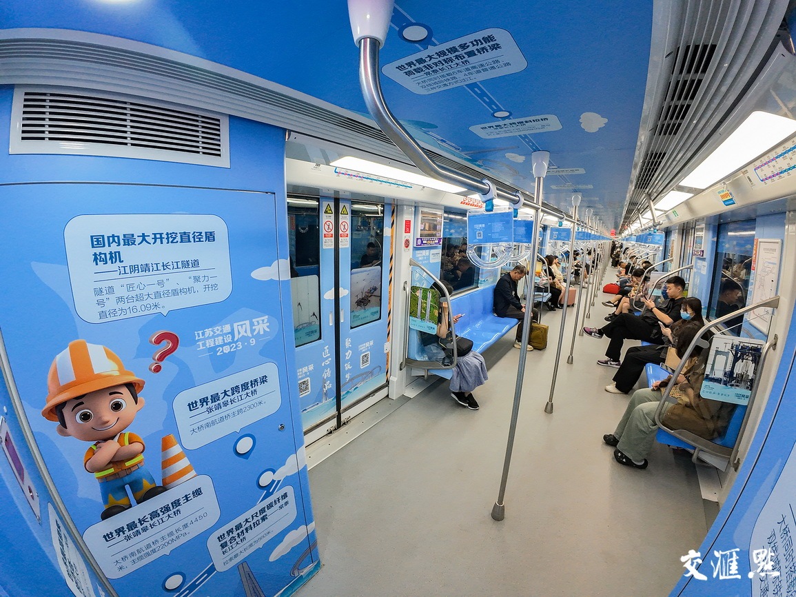 车厢内将江苏交通工程建设近年来创下的多个“世界首创”“世界第一”做了展示,科普交通工程建设知识。