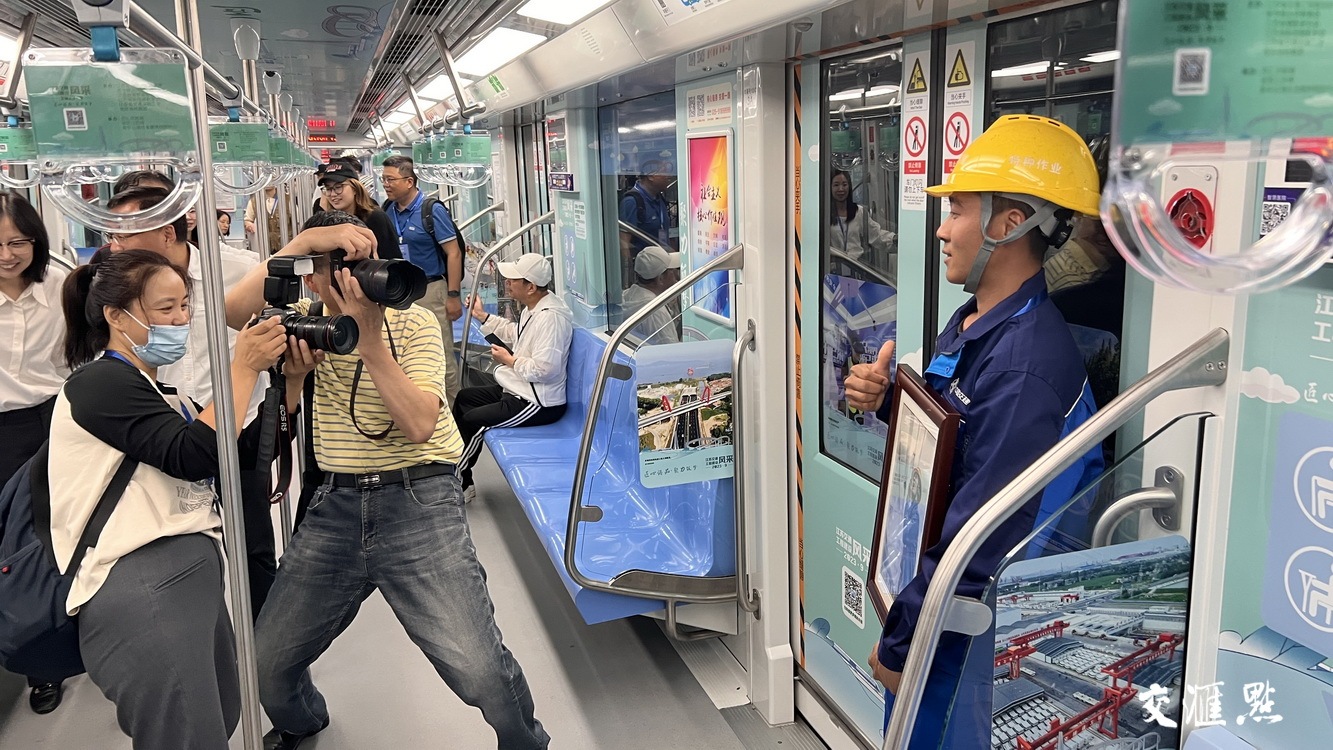 在地铁车厢内,摄影师给来自龙潭长江大桥建设一线参观工人留影。
