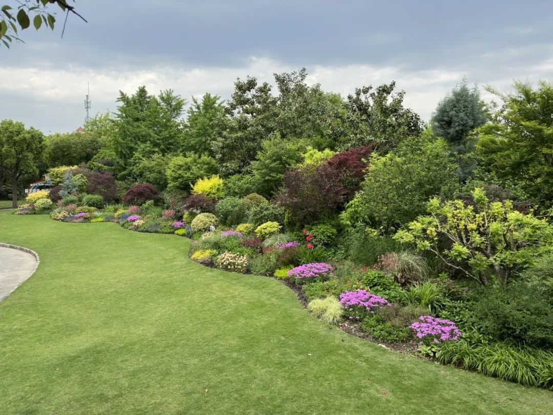 花境以雪松、各类柏树、金叶榆、金枝槐、红枫等苗木作为背景,借用地势,植物形成高低落差、错落有致,色叶形态丰富多变,与周边环境完美融合,展现出一种优雅、清静的山谷风貌。花境以蓝紫色为主色调、点缀少量橙色、红色。以罗汉松、厚皮香、品种枫树、小丑火棘、四季山茶、羽毛枫、金纹蒲苇、冬青、品种杜鹃等作为主要骨架植物,搭配柳叶马鞭草、幻紫鼠尾草、蛇鞭菊、紫叶钓钟柳、桑托斯马鞭草、穗花婆婆纳、鼠尾草‘波尔多’等宿根植物。花境植物高低错落,色彩轻盈,结合原有植物融合、和谐自然。