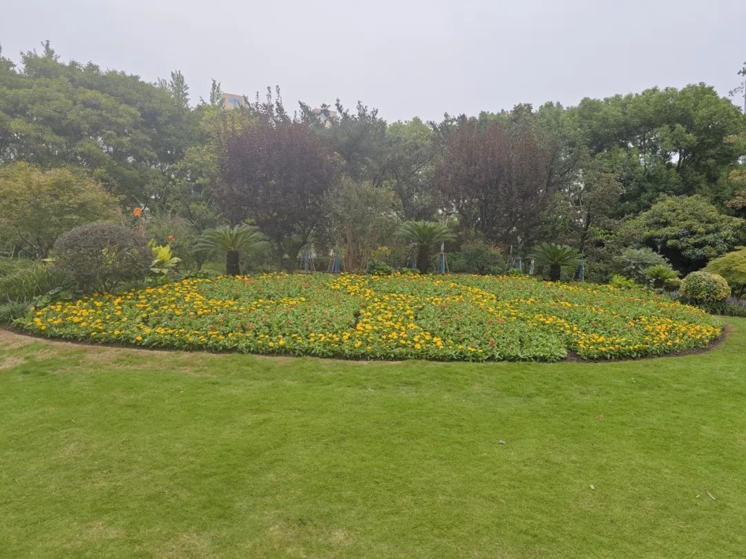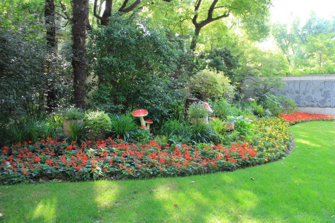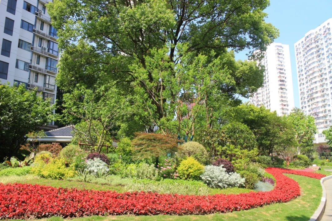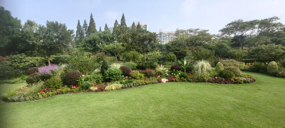 本花境以红黄色调为主,以高大乔木为背景,以桂花、紫荆、木绣球、金枝国槐等灌木小乔木作为骨架,搭配红花檵木,小丑火棘、圆锥厚皮香、羽毛枫等造型树及色叶树作为中层。本次在原有基础上增加了羽毛枫、红花檵木、卫矛、金枝侧柏、木绣球、郁李以及紫株,不仅丰富层次感,也增加中层植物结构稳定性,选用筋骨草、八宝景天、玉簪、大花葱、七彩朱蕉、赤胫散、红花鼠尾草等植物材料提升了花境整体色彩丰富,形成架构稳定,高低错落,色彩缤纷的大型花境,为整个长风公园增添了许多节日气氛。