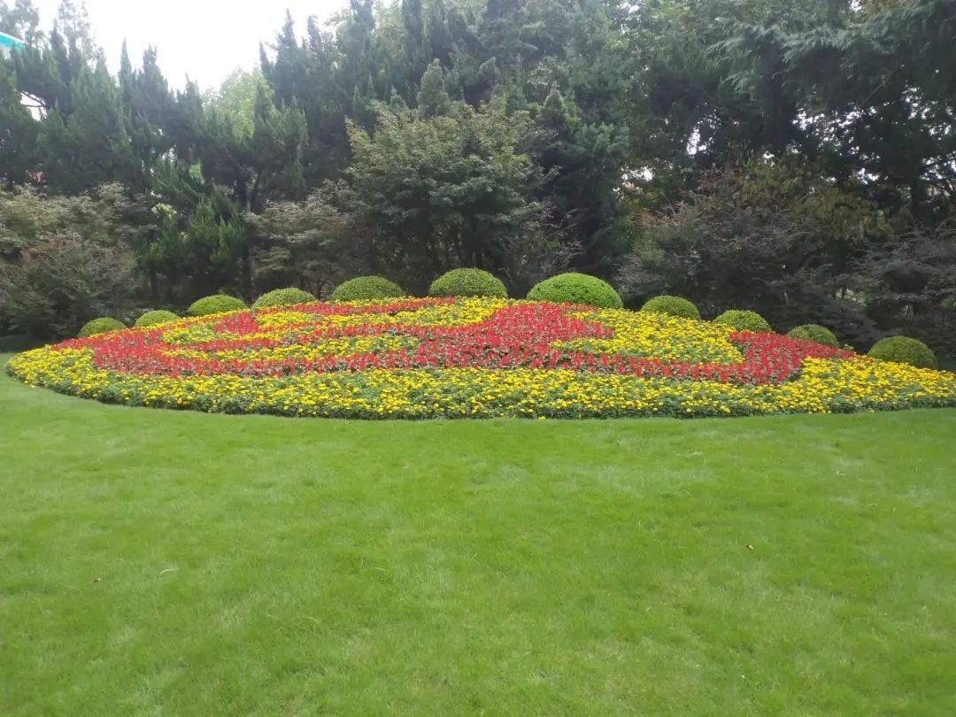 本花坛平面图案运用曲线、圆形元素勾勒出花瓣的形状,象征盛开的花朵,烘托花好月圆的美好氛围。花卉选择以红黄两色百日草,色彩对比强烈,营造出浓烈节日氛围。