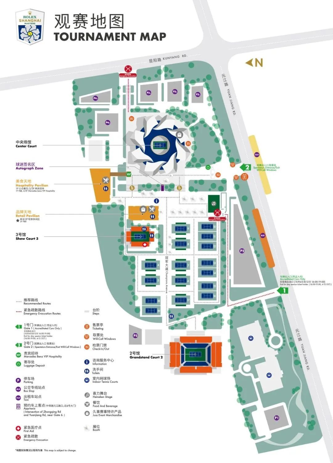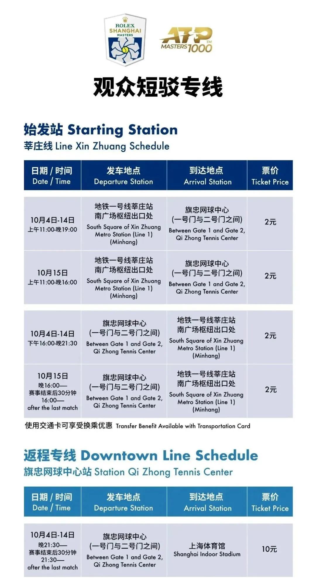 票务篇 每天的赛场开放时间及中央场馆检票时间是? 赛场开放时间(从元江路5500号旗忠网球中心2号门进入赛场的时间): 10月2日 10:00 10月3日-12日 11:00 10月13日-15日 12:30 中央场馆检票时间(在中央场馆外8号玻璃门、16号玻璃门前开始排队检票入馆,准备观赛的时间)