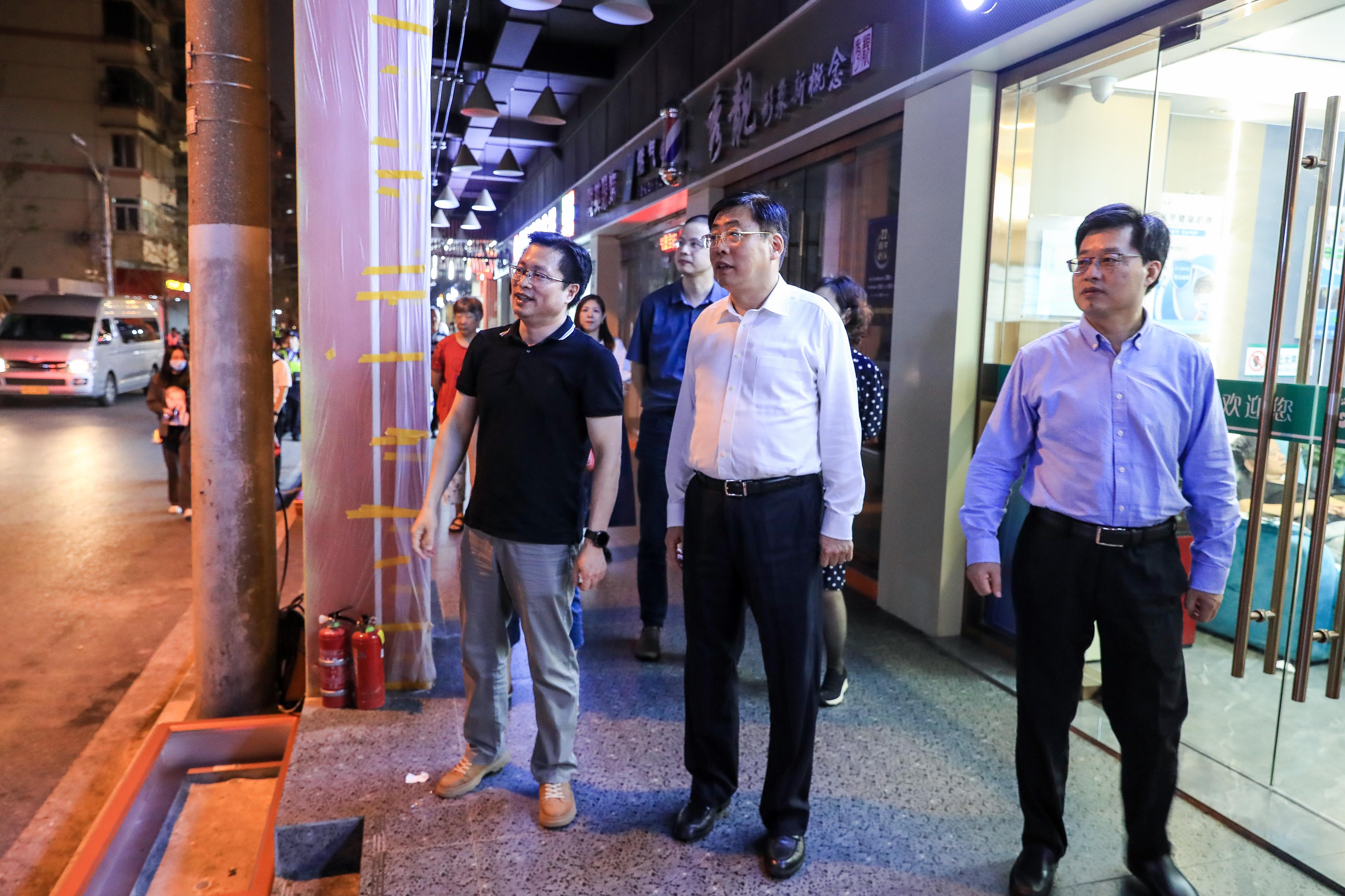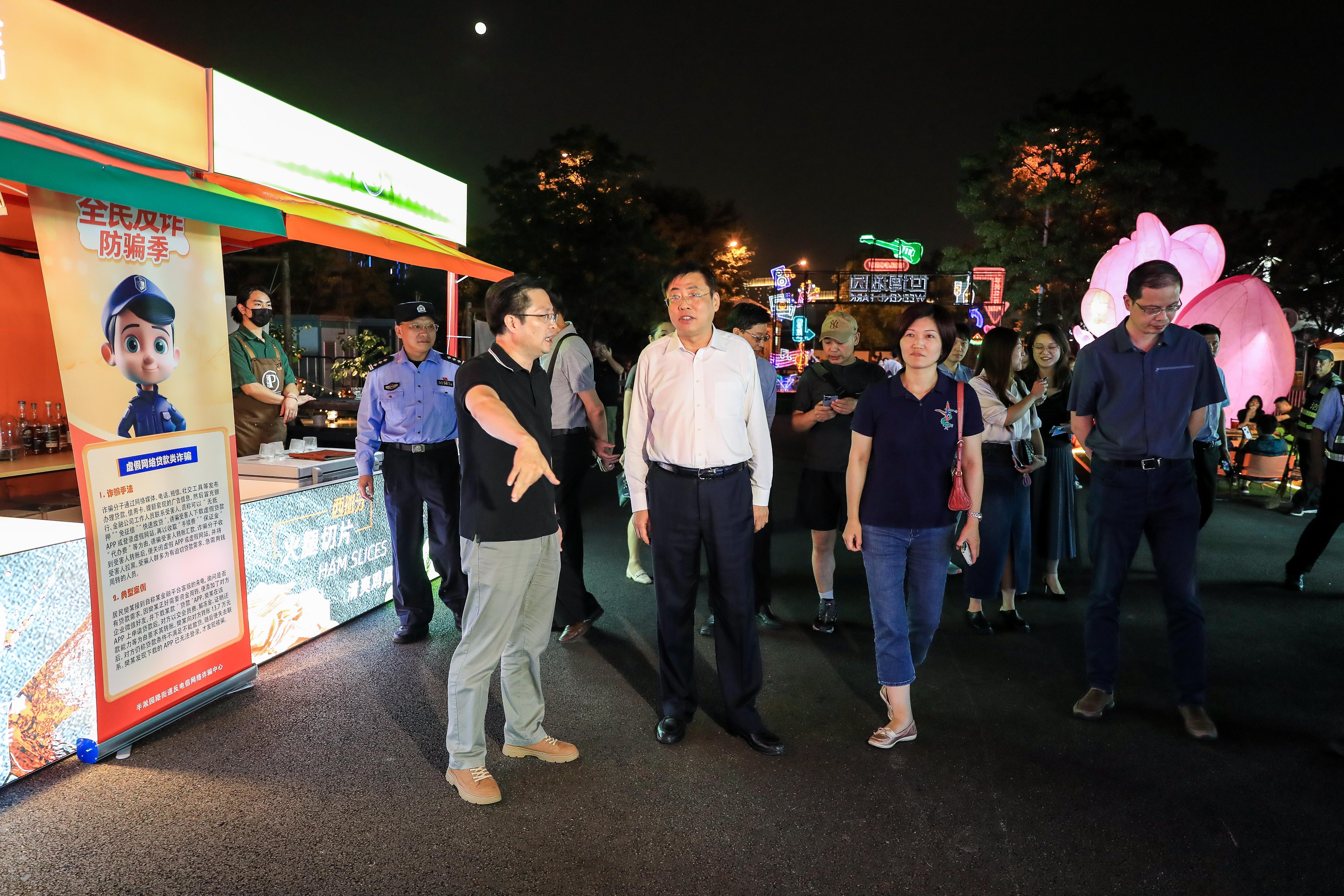 在世博淞园夜市,杲云检查节日期间夜间集市相关区域商业活动开展及安全保障工作情况,听取工作汇报;杲云还前往西凌家宅路,察看半淞园路街道“一街一路”项目建设情况。