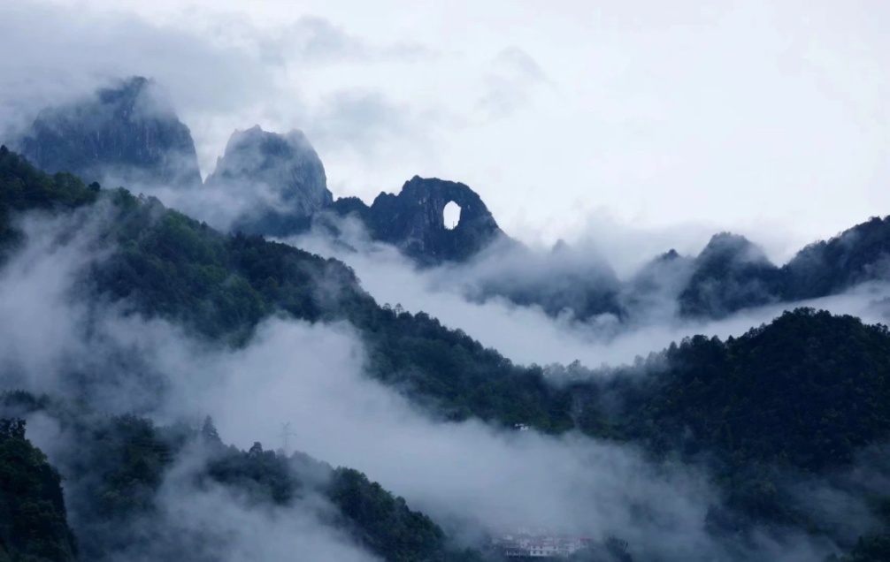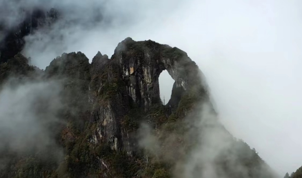 石月亮就在怒江西岸福贡县境内,高黎贡山的中段,3360多米海拔处,一座高耸入云的山峰上,因大理石岩溶蚀而形成的大洞,穿石而过,宽40余米、高达60米,形似巨大的圆球,傈僳语称它为“亚哈巴”,意为石月亮。