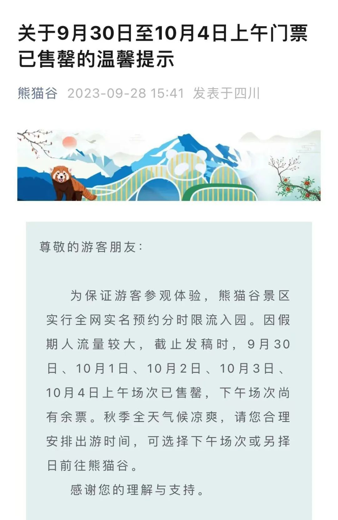 9月28日,四川成都大熊猫繁育研究基地发布消息称,因假期人流量较大,熊猫谷景区9月30日、10月1日、10月2日、10月3日、10月4日上午场次已售罄,下午场次尚有余票。请游客合理安排出游时间,选择下午场次或另择日前往熊猫谷。