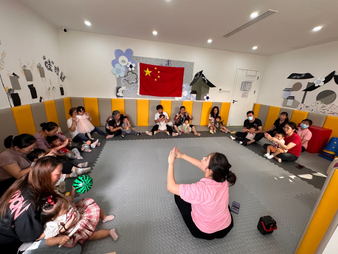 记者注意到,在活动正式开始前,家长带领宝宝们拍照打卡,手拿双节“相框”与国旗进行合影签到,让他们感受到节日的仪式感。随后,在优美欢快的歌声中,活动正式拉开序幕,孩子们、家长们在老师的带领下欢聚一堂,共同庆祝中秋国庆双节到来。活动首先进入音乐律动环节,以歌曲《歌唱祖国》作为背景音乐,歌词内容简洁质朴,却传达着强烈的情感。老师根据歌词内容,引导家长与孩子们共同做出相应的动作,如红旗飘扬、歌声响亮等,通过唱唱跳跳的形式,锻炼了宝宝的节奏感及四肢协调能力。