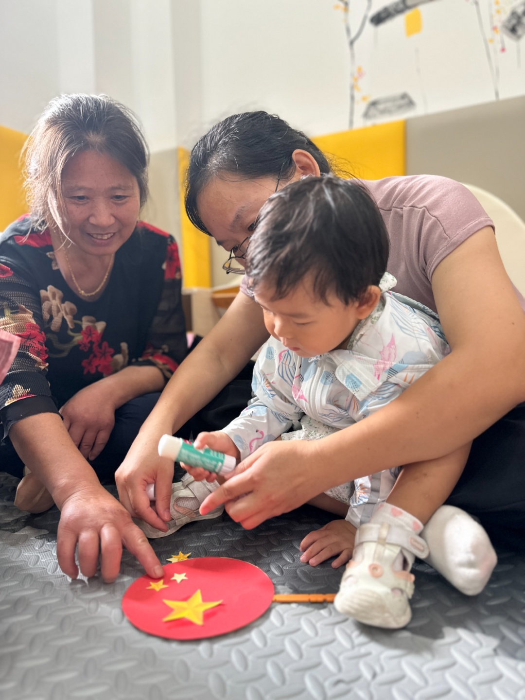 亲子活动有“武”也有“文”。在运动之后,老师们开始了团扇制作的小课堂。团扇作为一种传统的工艺品,在中秋节有着特殊含义,寓意着团圆和美满。在这次活动中,通过将五星红旗与团扇进行结合,让宝宝们体验了一次特殊的团扇制作。在制作过程中,小朋友通过捏、撕、涂、贴、拉等动作,锻炼手部的精细动作和灵活性。从而练习手部的精细动作和灵活性。此外,宝宝们还可以感受到自己动手制作的乐趣,以及与家长之间的亲密互动和交流。