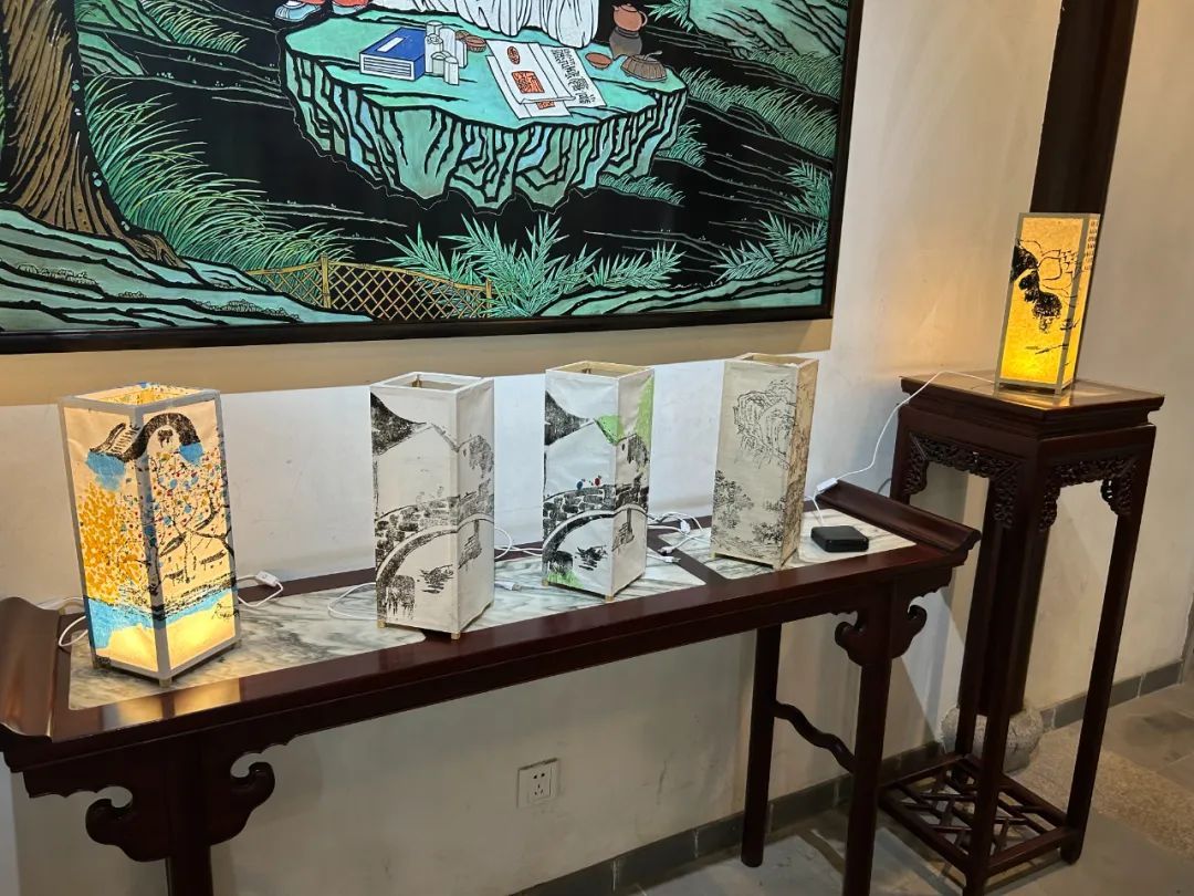长条几案上,拓板、宣纸、拓包、油墨等工具一应俱全。市民们先将油墨均匀地刷在拓板上,再将宣纸对准拓板轻轻放下,不断按压后,拓板上的油墨就拓印到了宣纸上。经过反复按压,一张张古风十足的灯笼纸便制作完成。