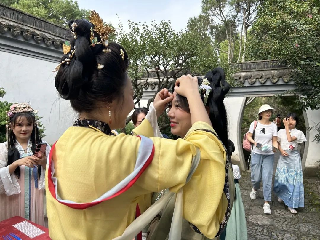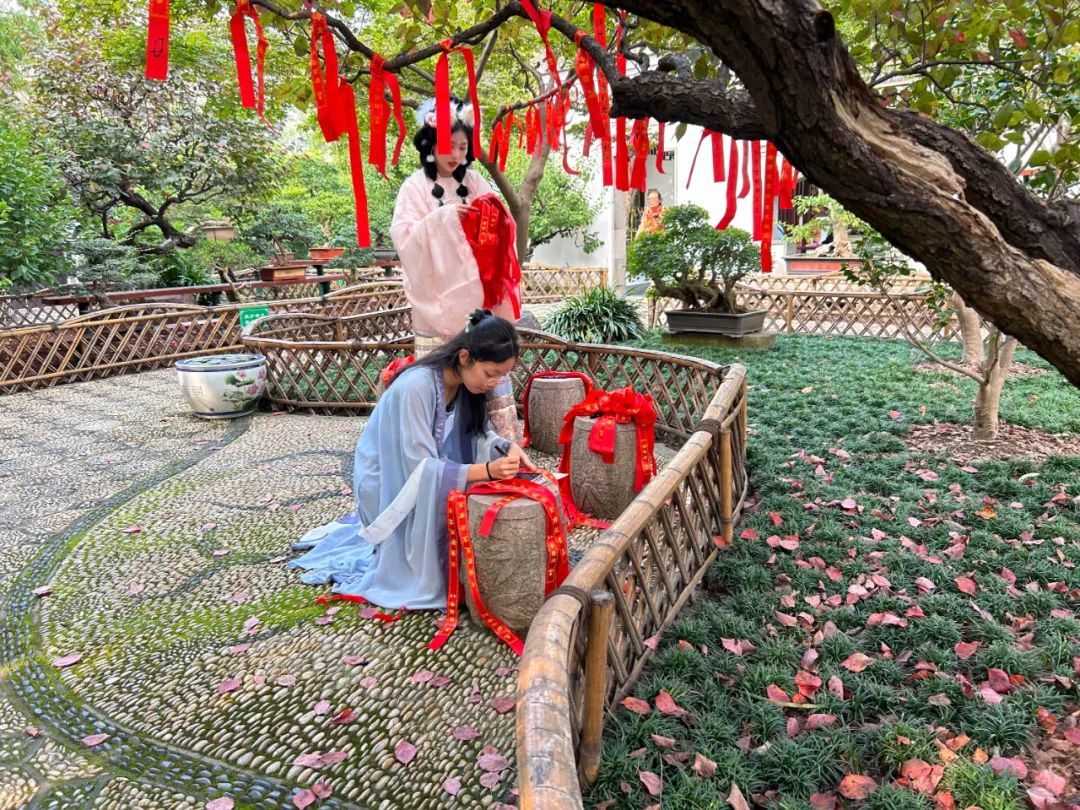 做完灯笼还不过瘾?市民们穿着传统服饰,走入精致的盆景园,重温庭院中的雅事,在不同的节俗展示体验区,和明代仕女、文人、嫦娥、玉兔等角色相遇,踏着历史的青石板,感受400年前的中秋仪式感,共同演绎明人的中秋习俗长卷。