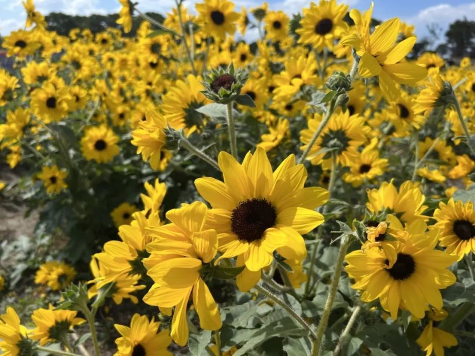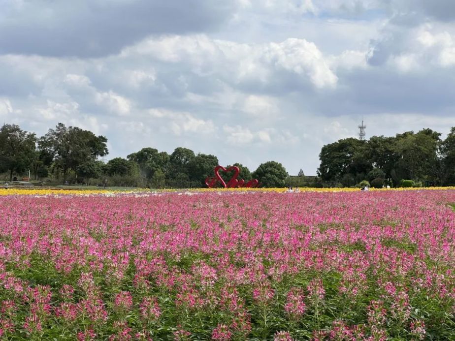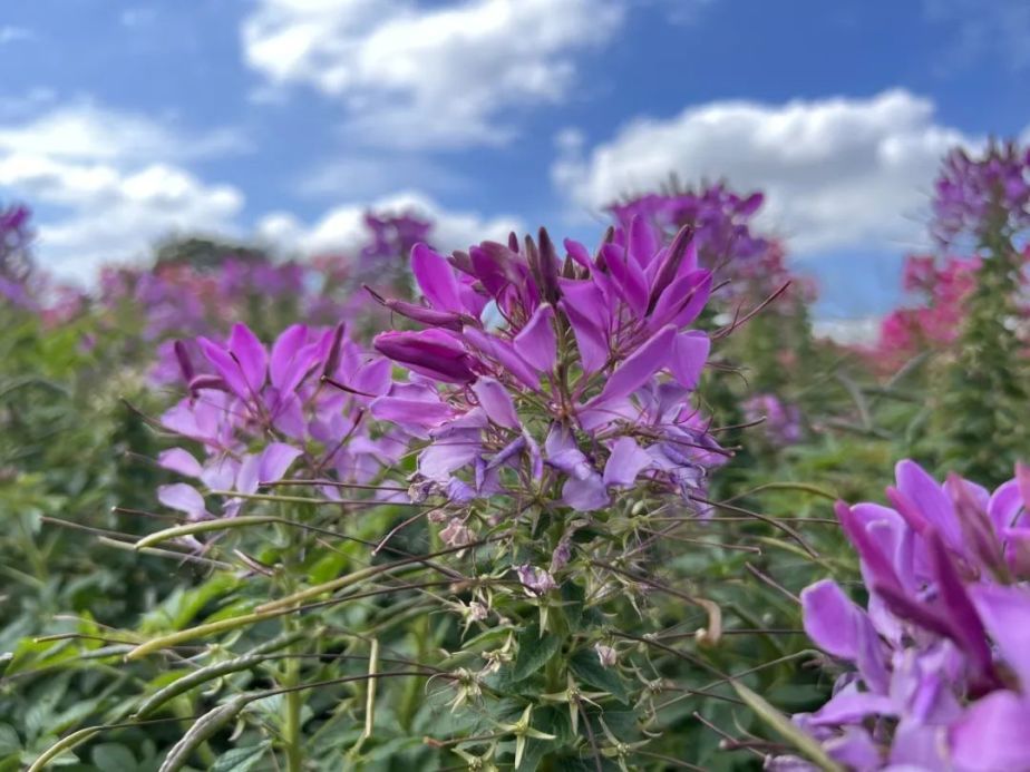 在周浦花海怎么能不看花呢,一串红、孔雀草、鼠尾草、大花海棠、赤壁鸡冠,依次排开美不胜收,更有成片的醉蝶花、向日葵、地肤、柳叶马鞭草、粉黛乱子草分布整个园区,怎么拍都好看。