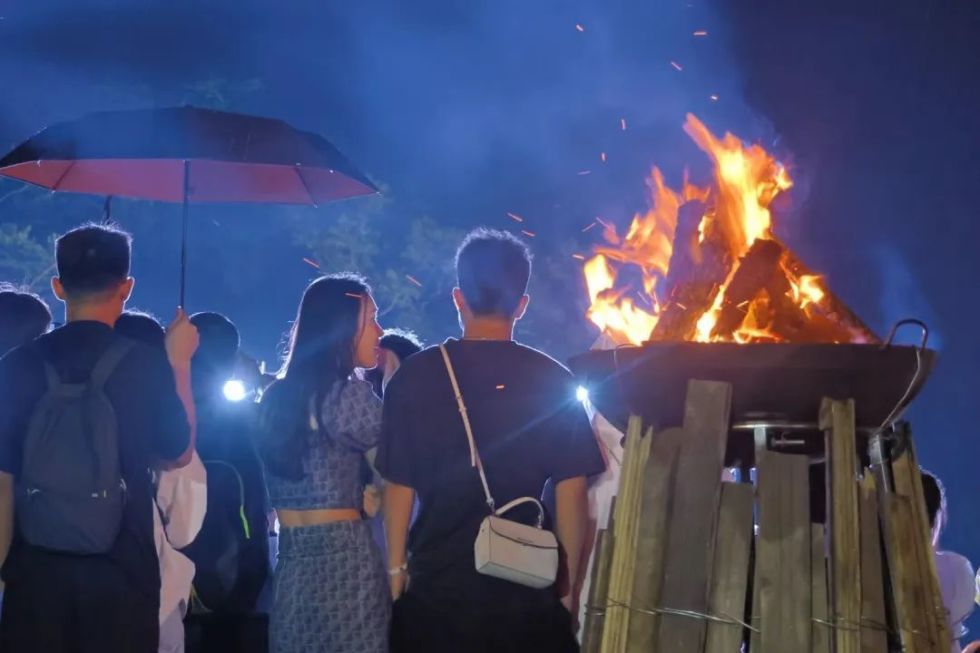 篝火晚会,点点火星灿漫,一起歌唱、舞蹈,感受欢乐氛围。