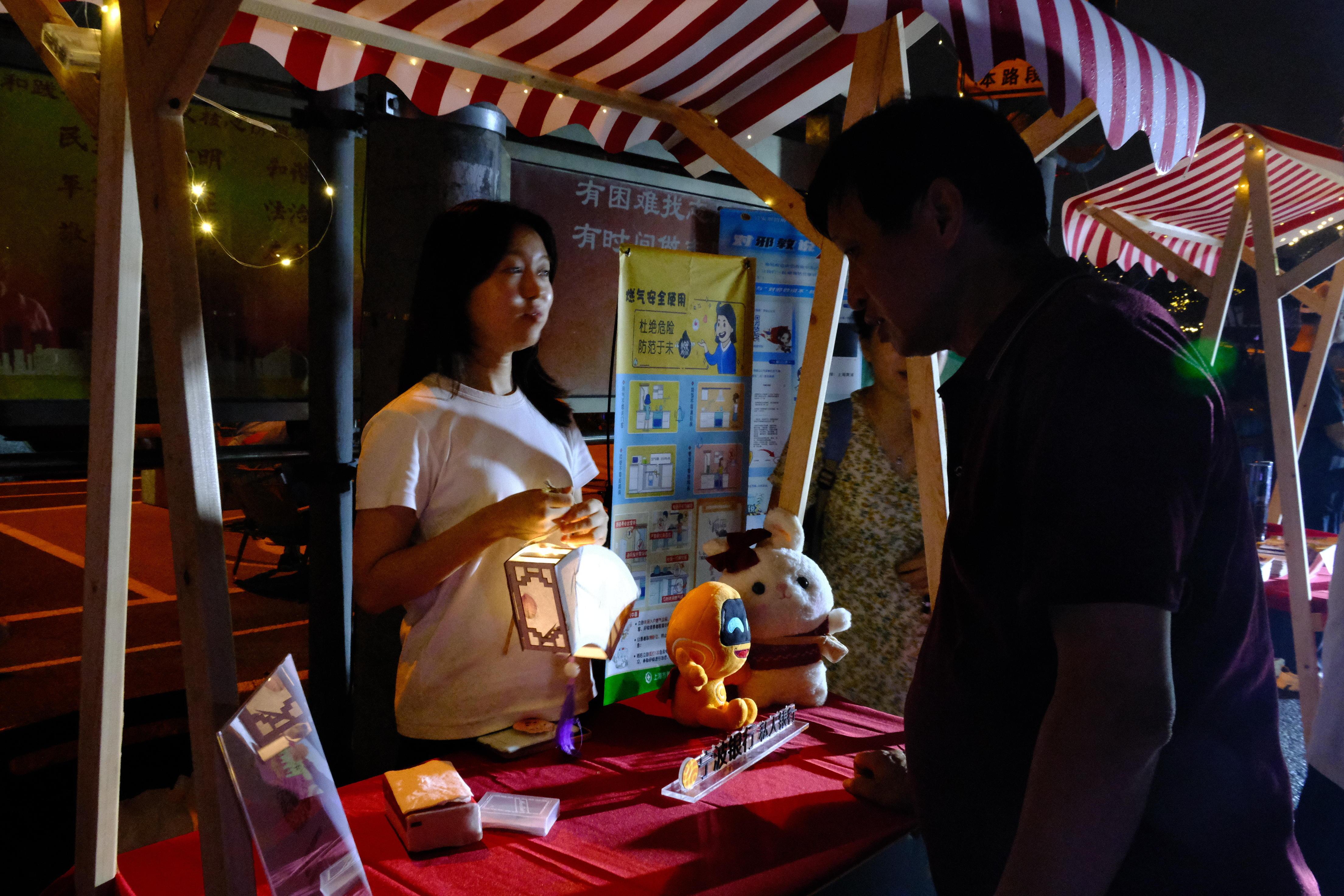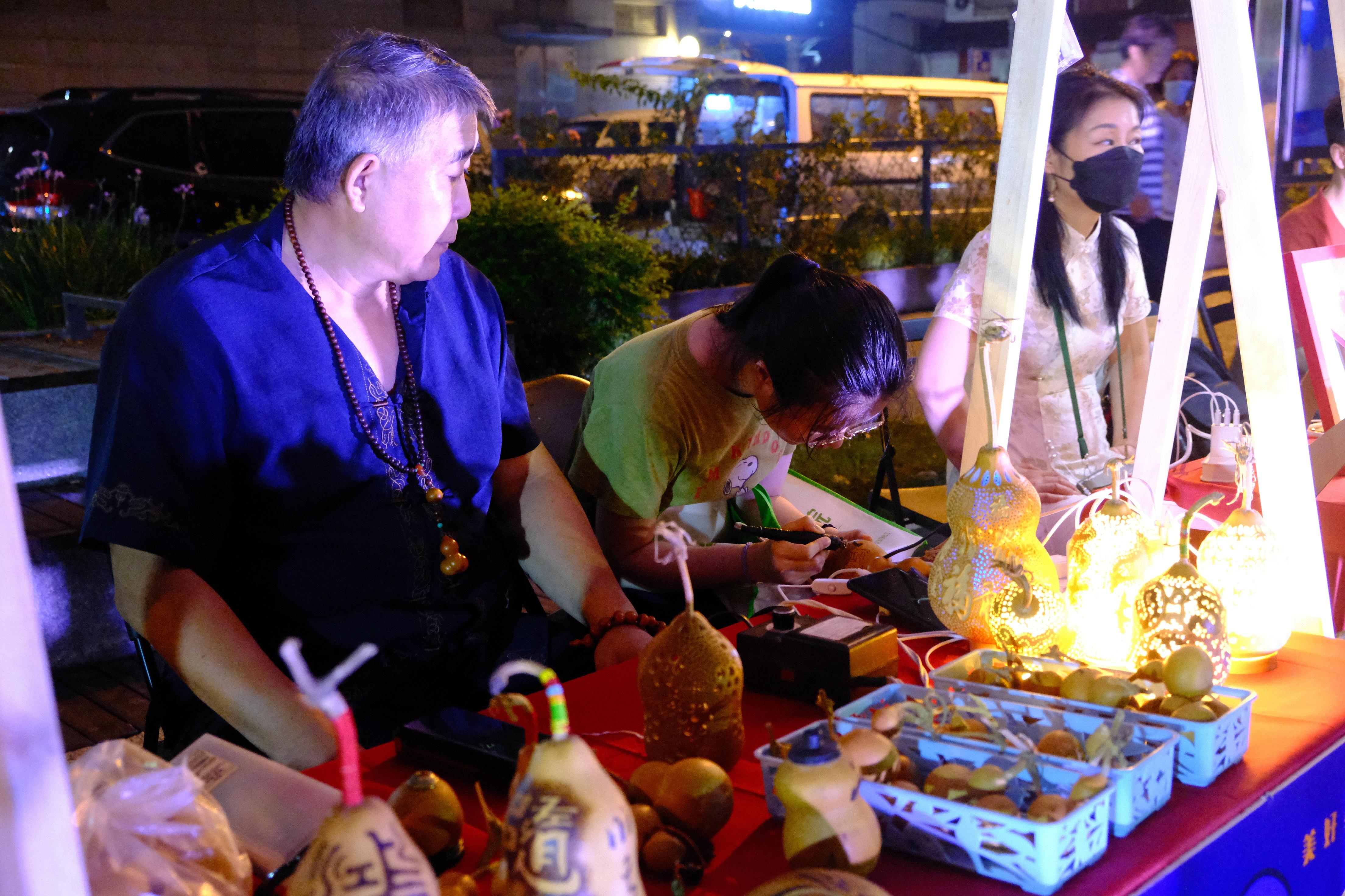 此次活动恰逢庆祝中秋节和国庆节。街道特意设置了“非遗讲堂+现场体验”区域,以传统文化为集市添彩的同时,让非遗文化更好地走进孩子们的心里,走进老百姓的生活。非遗传承人罗立把瓶雕、篆刻技艺应用到葫芦雕刻和葫芦烙画中,形成了海派葫芦艺术雕刻技艺。活动现场,罗立一边介绍葫芦灯的起源和发展,一边把一只只憨厚敦实的葫芦变成玲珑剔透的葫芦灯,引得孩子们啧啧称奇,看得目不转睛。另一边,孩子们围坐在露营区,在工作人员的指导下学做“兔子灯”。家长们看着孩子们认真投入的模样,为东风夜市点赞说:“既让孩子们很好地领略了中华传统文化,又在动手、动脑中提升了孩子们的综合素养,太棒了!”