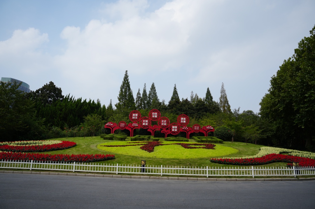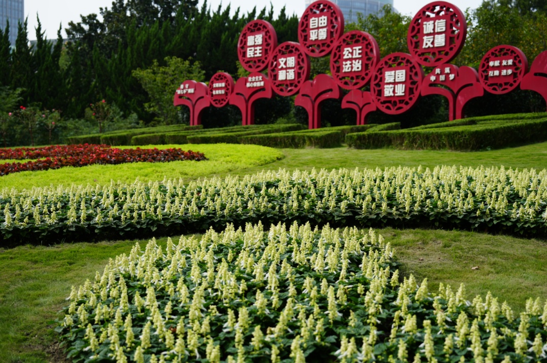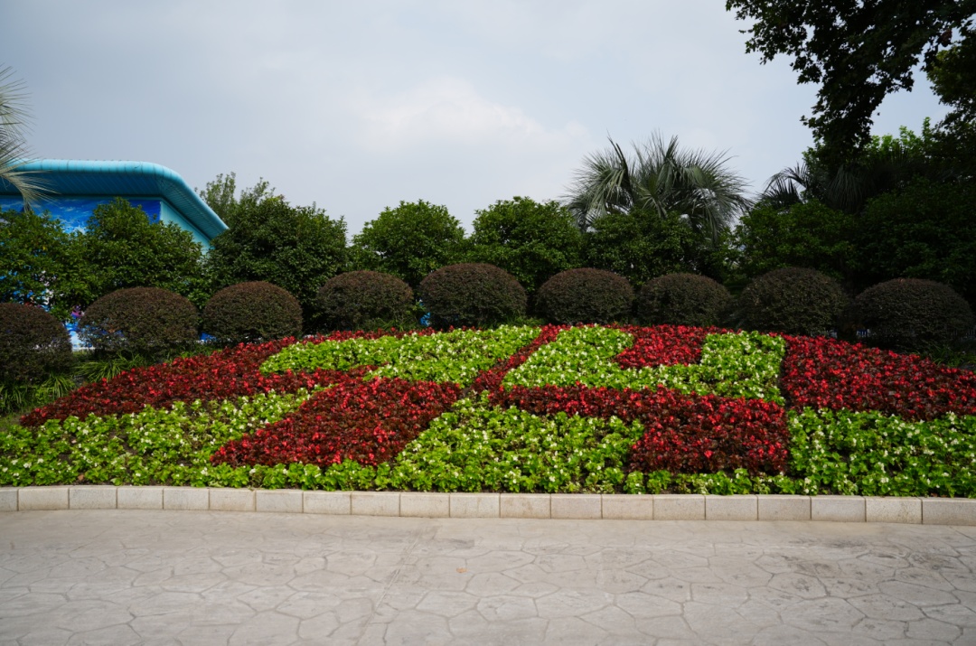 在长风公园1号门,花坛以“和”为主题,寓意祖国安定、和平,百姓幸福生活以及和谐、祥和的社会风貌。花坛采用红色四季海棠勾勒出“和”字,金叶佛甲草构成圆形背景,一串红和一串白组成的双色曲线飘带图案为花坛增加了延展性。