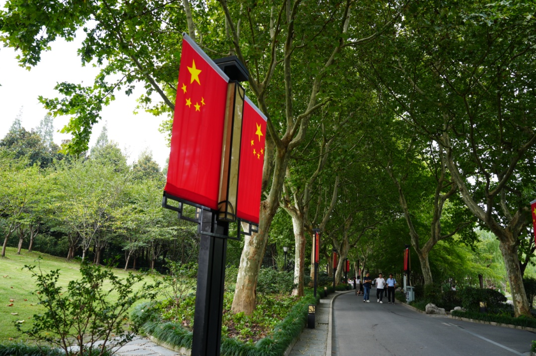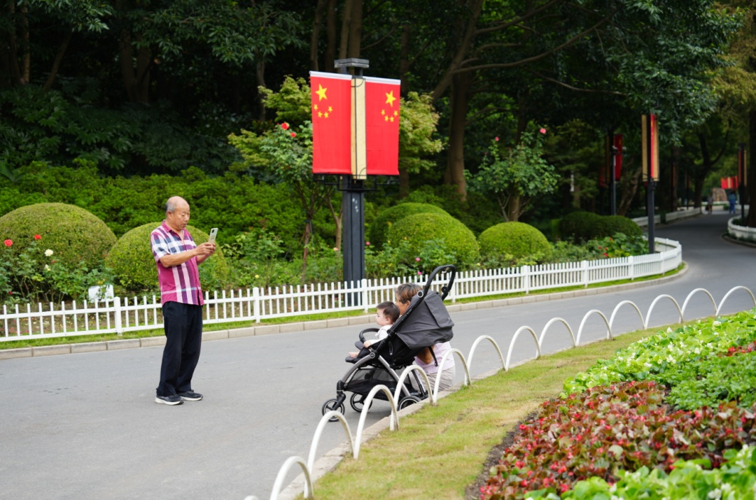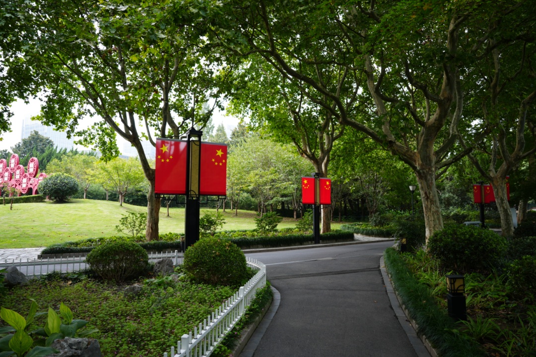 近日,记者走进普陀区长风公园,映入眼帘的是一片鲜艳的“中国红”,一面面五星红旗挂满公园和入口沿街处,迎风招展,公园内一派欢乐祥和的氛围。