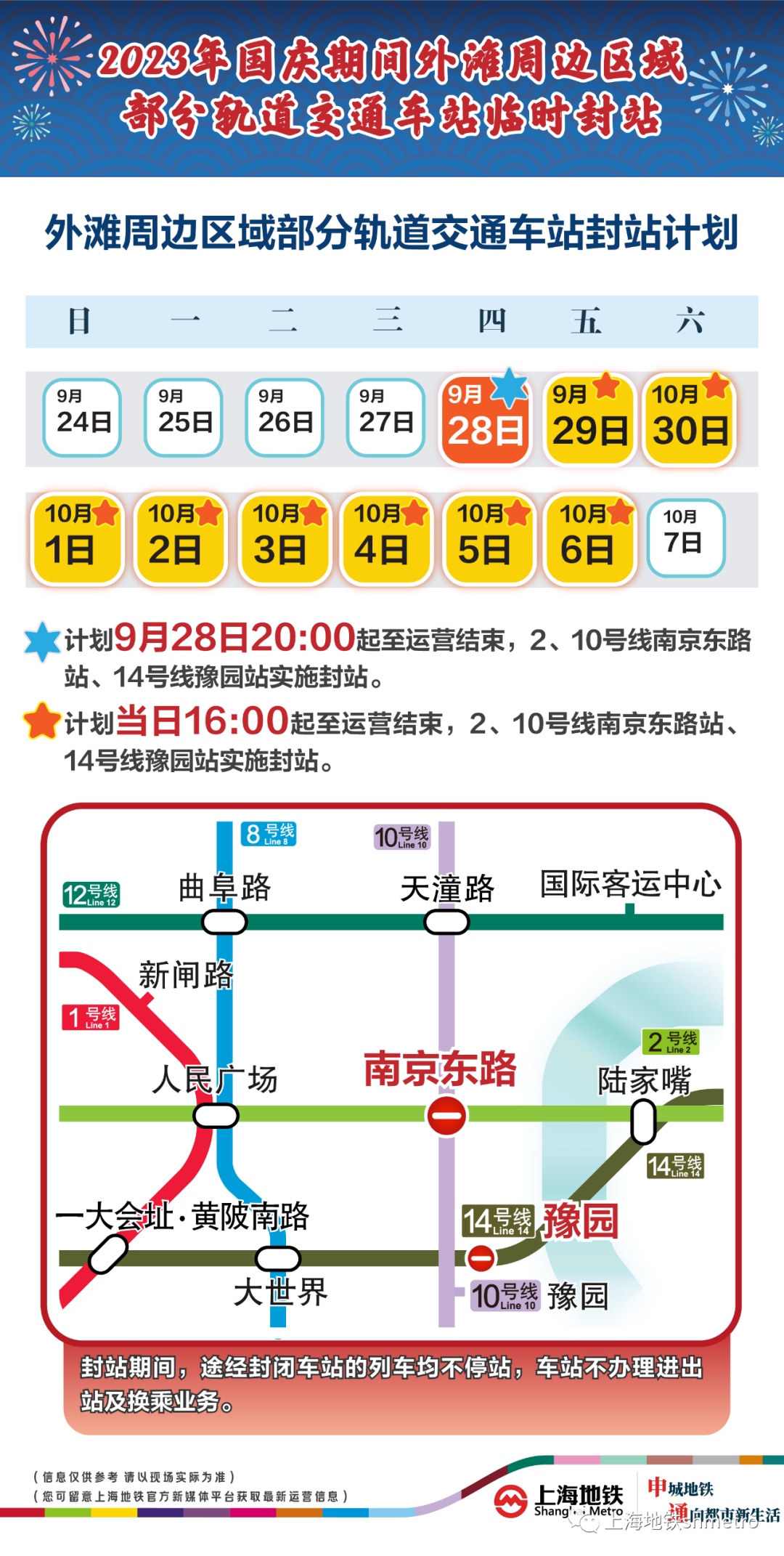 根据交通管制工作方案,9月28日20:00起至运营结束,9月29日至10月6日,每日16:00起至运营结束,地铁2、10号线南京东路站,14号线豫园站将计划实施封站跳停。封站时段内,在2、10号线南京东路站,14号线豫园站不能上下车,地铁站出入口也将同步关闭,乘客不能进出车站。届时,车站将加强站内广播宣传、导向设置、站台站厅秩序维护等工作。