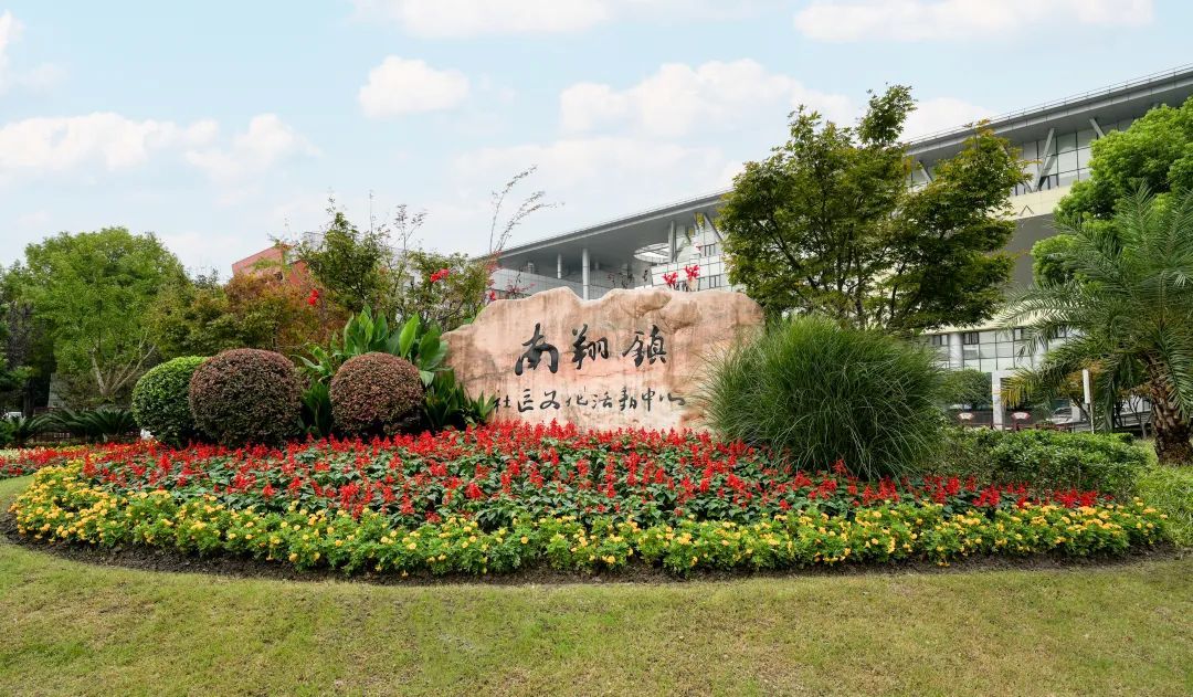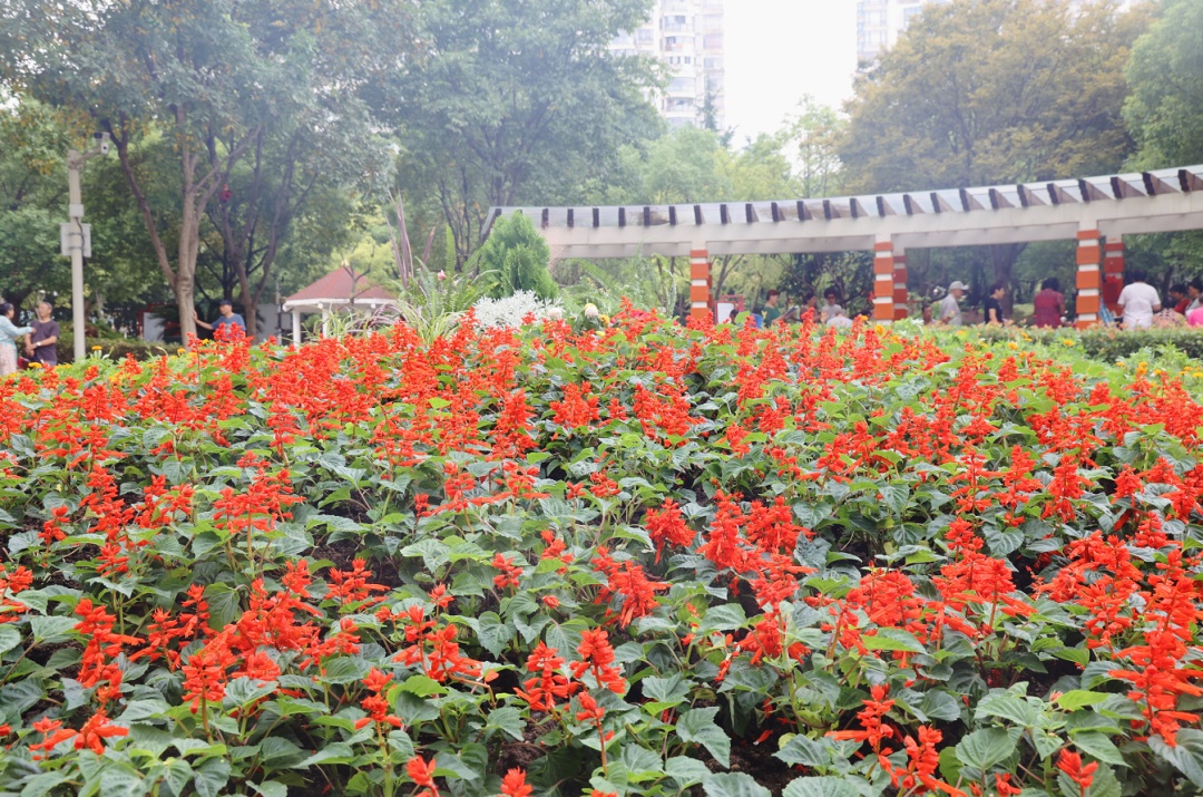 在古猗园路和裕丰路路口,南翔镇社区文化活动中心广场前的一片一串红在蓝天白云的映衬下显得分外艳丽。为迎接双节,该广场布置了近300平方米的四季草花,让前来参加文体活动的市民感受浓浓的节日氛围。