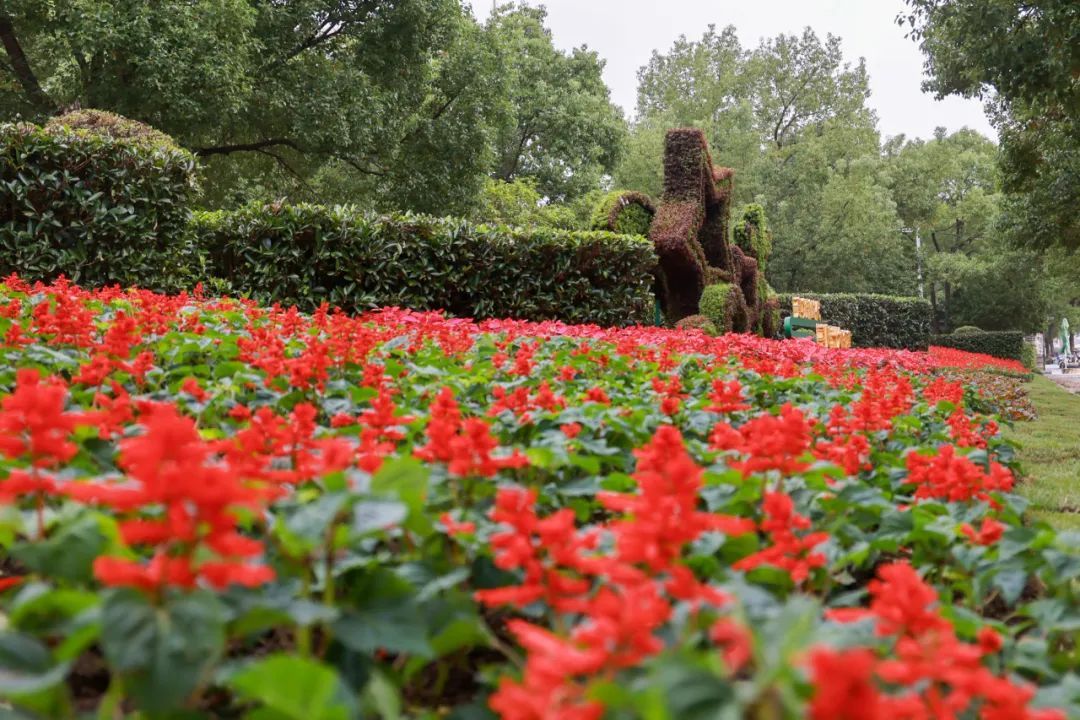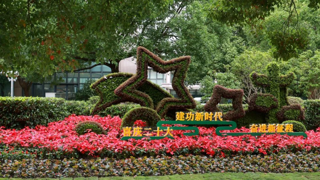 徐行镇人民政府南侧沿街花坛布置了9000多盆花卉,总面积约255.8平方米,品种以圣诞花、一串红、四季秋海棠为主。整个花坛中心位置是立体的五角星造型,外部由绿草和红草勾勒,体现红色文化与绿色生态的融合,色彩鲜艳,氛围喜庆、祥和。