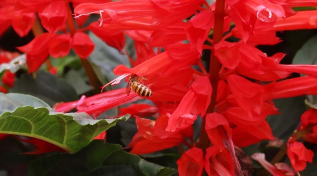 汇源路南侧,不同颜色的鸡冠花拼成一只翅膀的形状,仿佛在展翅飞翔。鸡冠花的外形有的像喇叭花、有的像玉米、有的像扇子,形状各异,姿态万千。徐风轻拂,花朵随风飘扬,引得不少路人驻足观赏,蜜蜂也前来凑热闹,一派欣欣向荣的景象。