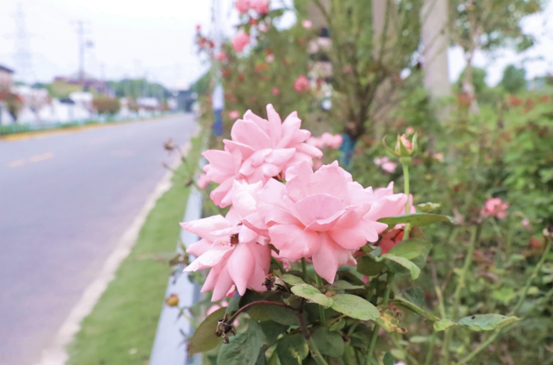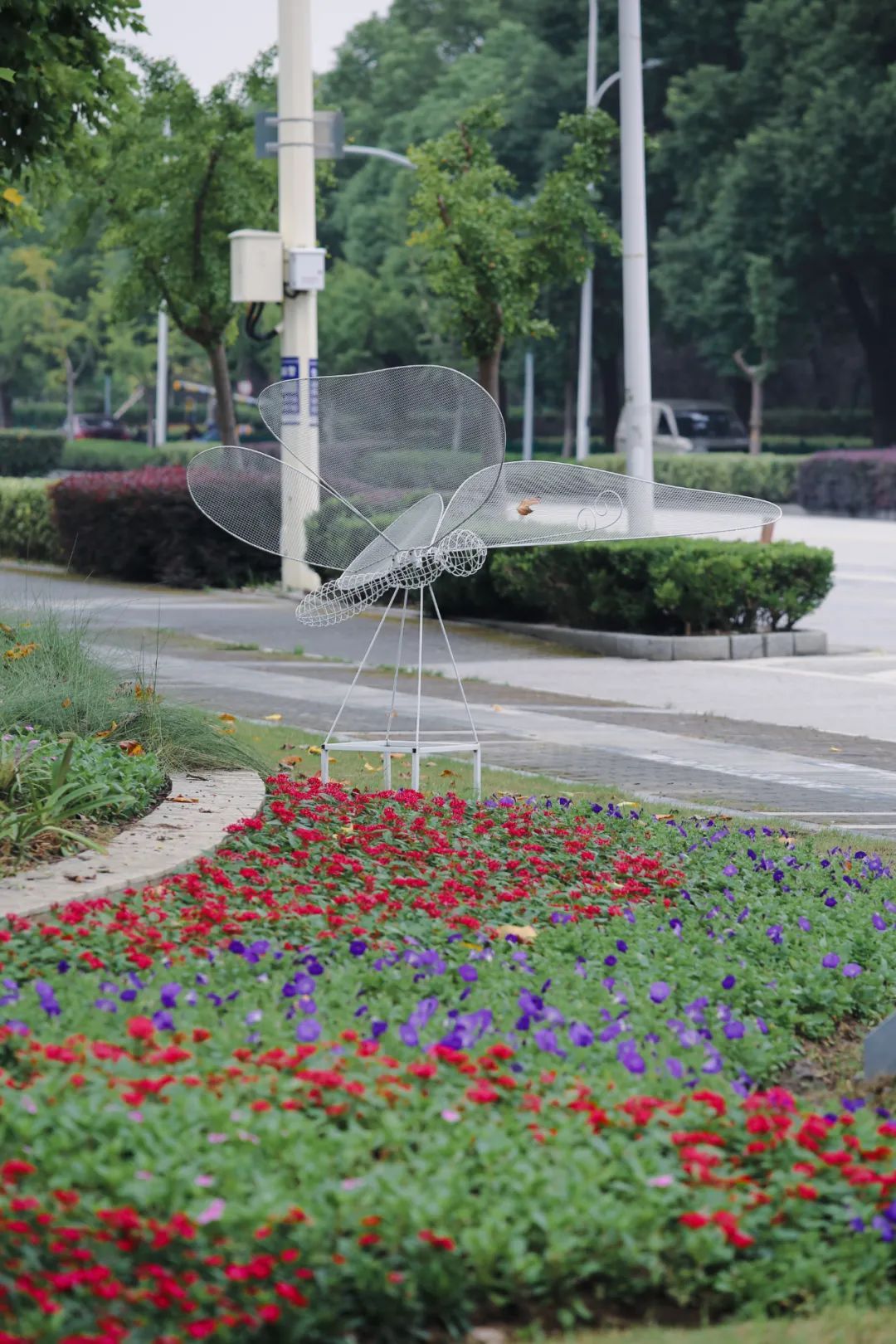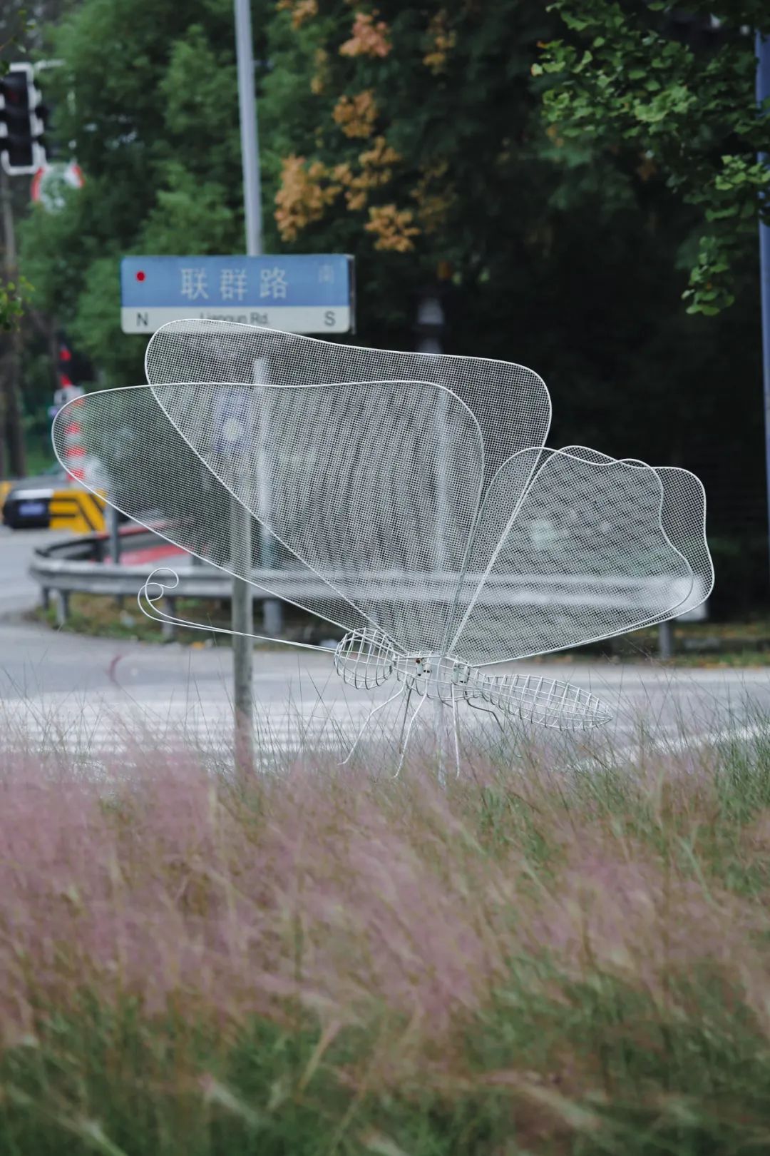 在G15曹安公路高速路口,各种颜色的花朵竞相开放,美不胜收。花坛四周绿草如茵,一旁的粉黛乱子草随风摇曳,一些硕大的、栩栩如生的“蝴蝶”徜徉在花海中“翩翩起舞”,如在森林般自然欢快。
