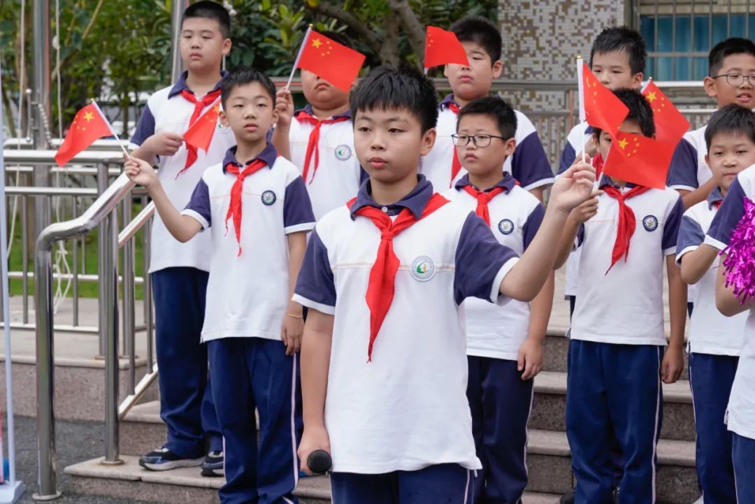 当天上午,在孩子们深情的演唱声中,活动拉开了序幕。队员们挥舞着手中的五星红旗,表达对祖国的热爱之情。“国旗班”的小旗手们昂首挺胸,踏着整齐划一的步伐,护送着五星红旗。
