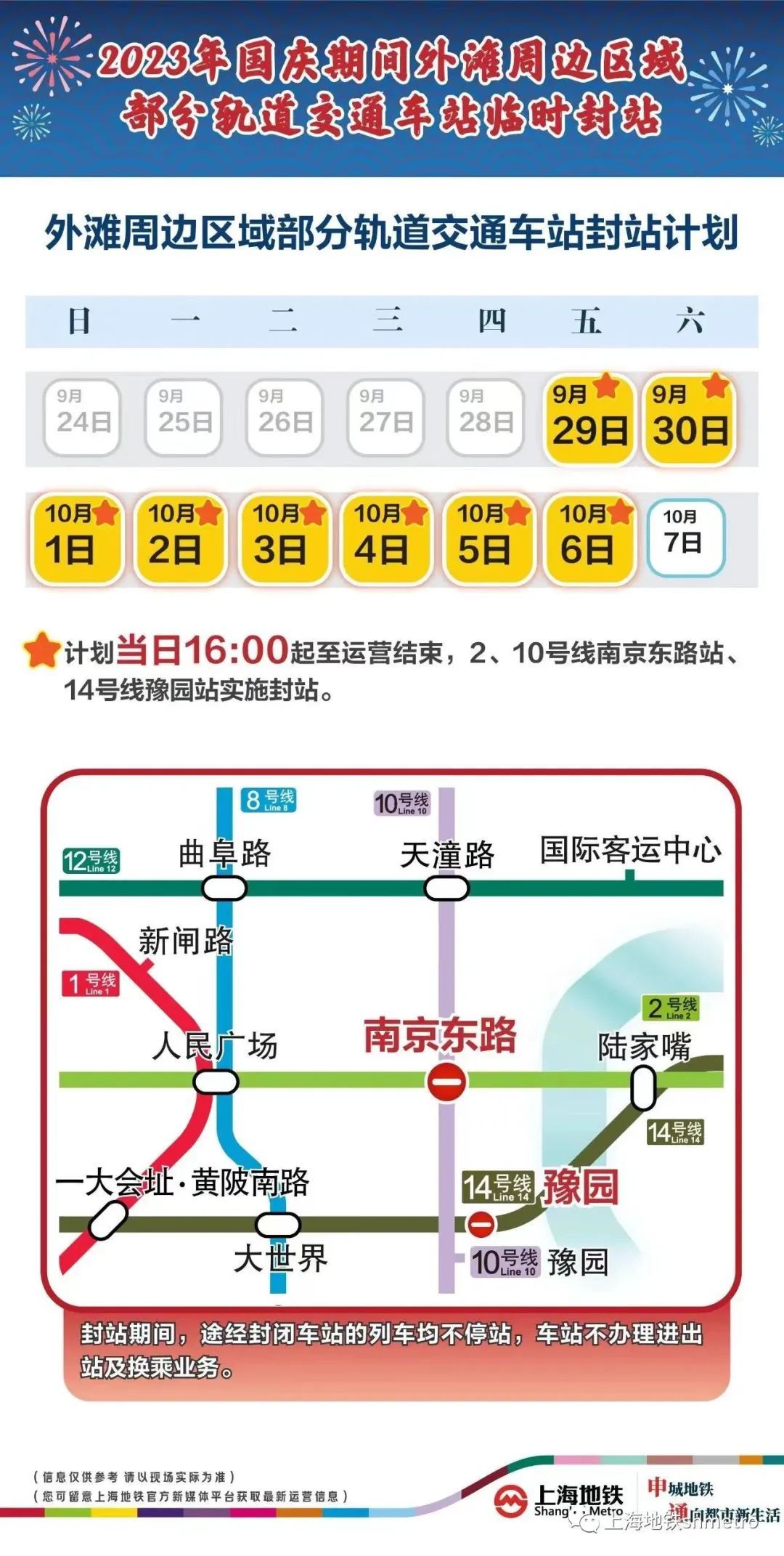 出行提示 9月29日至10月6日,每日16:00起至运营结束,地铁2、10号线南京东路站,14号线豫园站实施封站。 封站时段内,在2、10号线南京东路站,14号线豫园站不能上下车,地铁站出入口将同步关闭,乘客不能进出车站。需要提醒乘客的是,14号线豫园站临时封站期间,10号线豫园站仍正常运营。