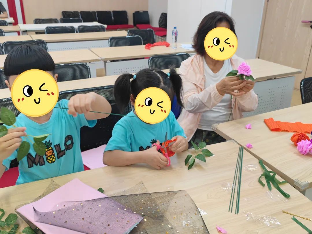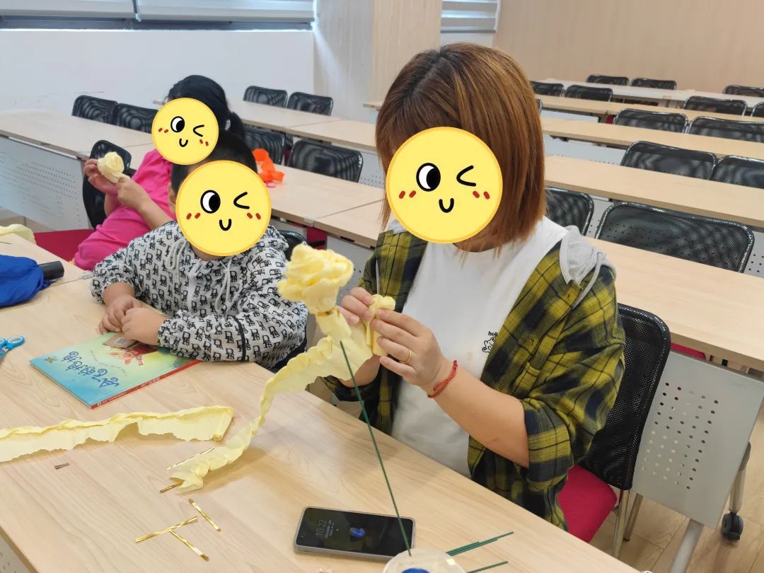 继自然美育类活动后,紧接着又迎来了孝亲敬老类绘本活动,活动以绘本《爷爷一定有办法》这个温情而有力量的故事展开。孩子们聚精会神地听着老师讲述这个富有深刻教育意义的故事,深切地感受到了浓厚和谐的家庭氛围。阅读完绘本后,亲子家庭又齐心制作了充满美好寓意的曼达拉,一圈又一圈,变化的线条在指尖缓缓晕开,完整的图案跃然而出,孩子们心中美好的愿景也跟随图案慢慢浮现。 课堂上,温暖的《会飞的抱抱》绘本故事和精美的手工花束为孝亲敬老类绘本活动画上了完美句号。绘本展现了亲情与爱的力量,孩子们都被小猪为表达爱所付出的努力所感动,这个温暖的故事也让孩子们清晰地意识到亲情的珍贵和传递爱的重要性,促进了完整人格的养成。阅读完毕,老师耐心讲解了花束的制作过程,孩子们跃跃欲试,现场气氛十分活跃。家长们带领孩子们在一片欢声笑语声中共同制花、包花、装花,最后,孩子们将亲手制作的花带回家送给最爱的人,以表达他们最纯结最真挚的爱意。