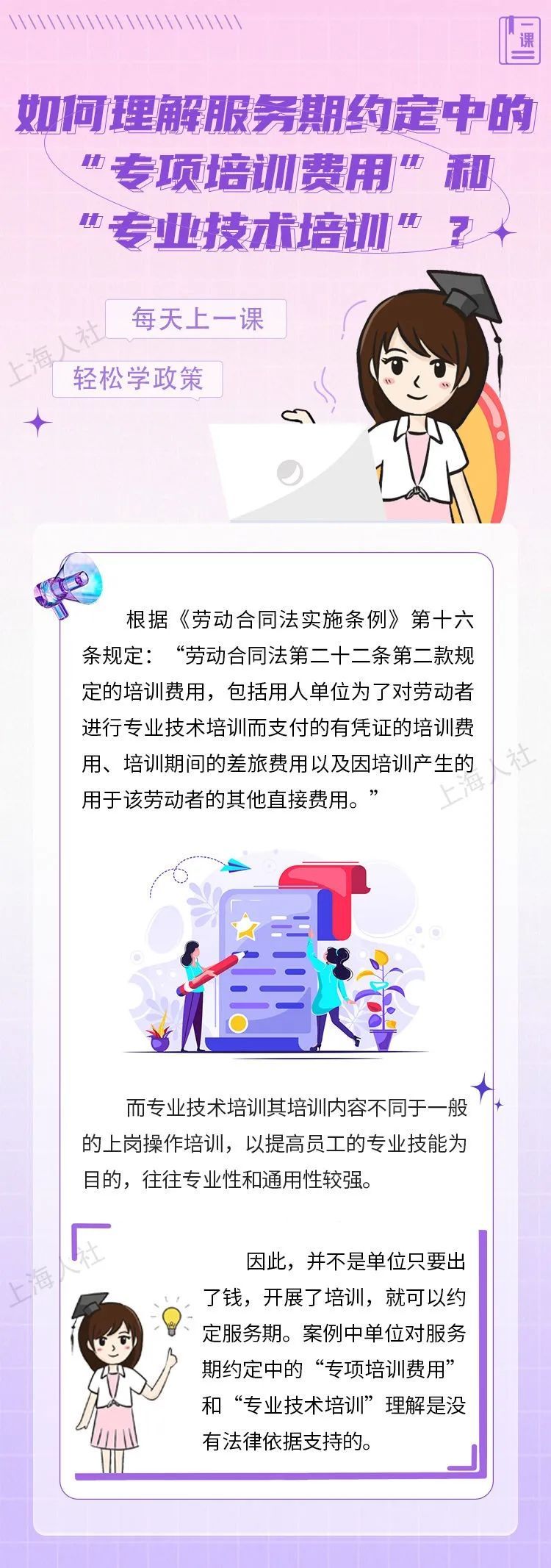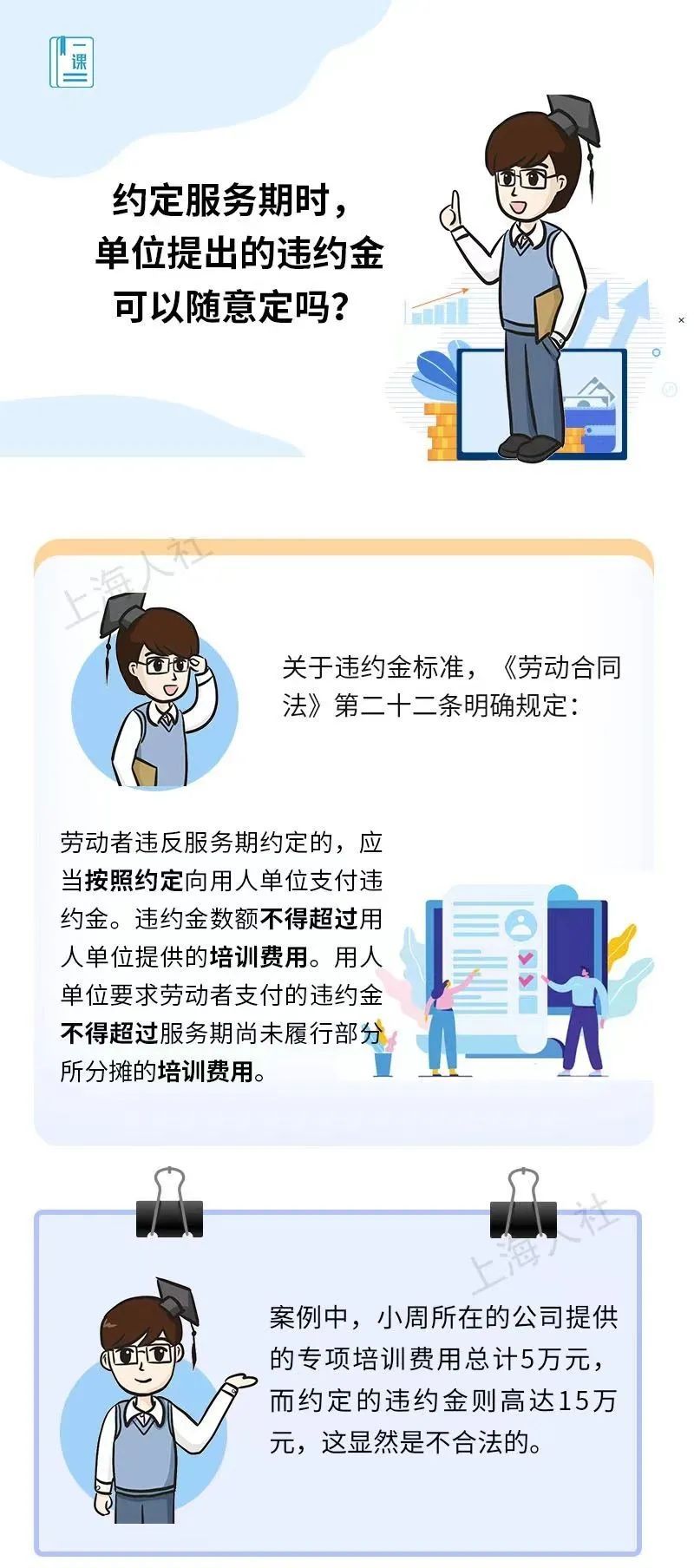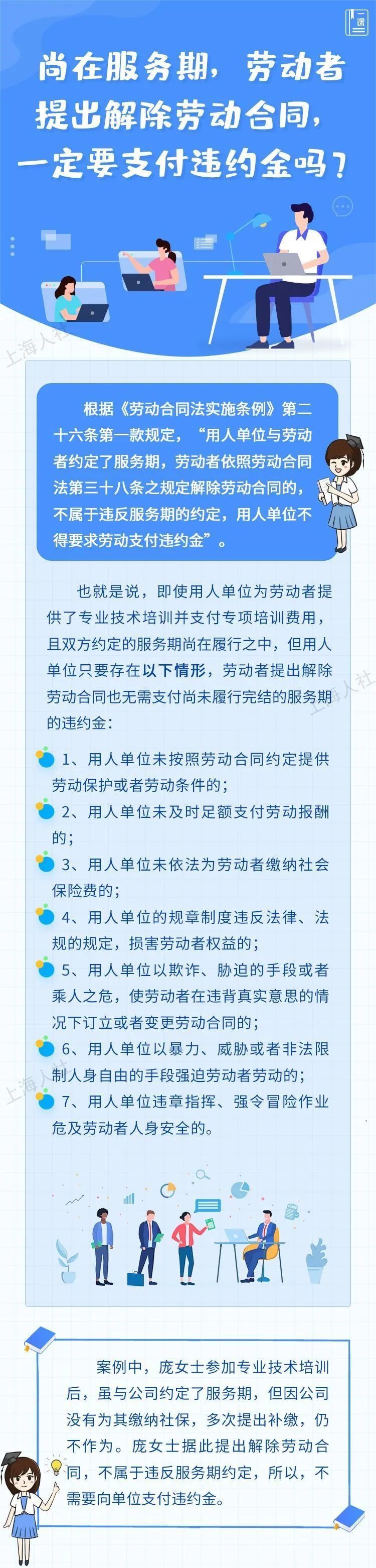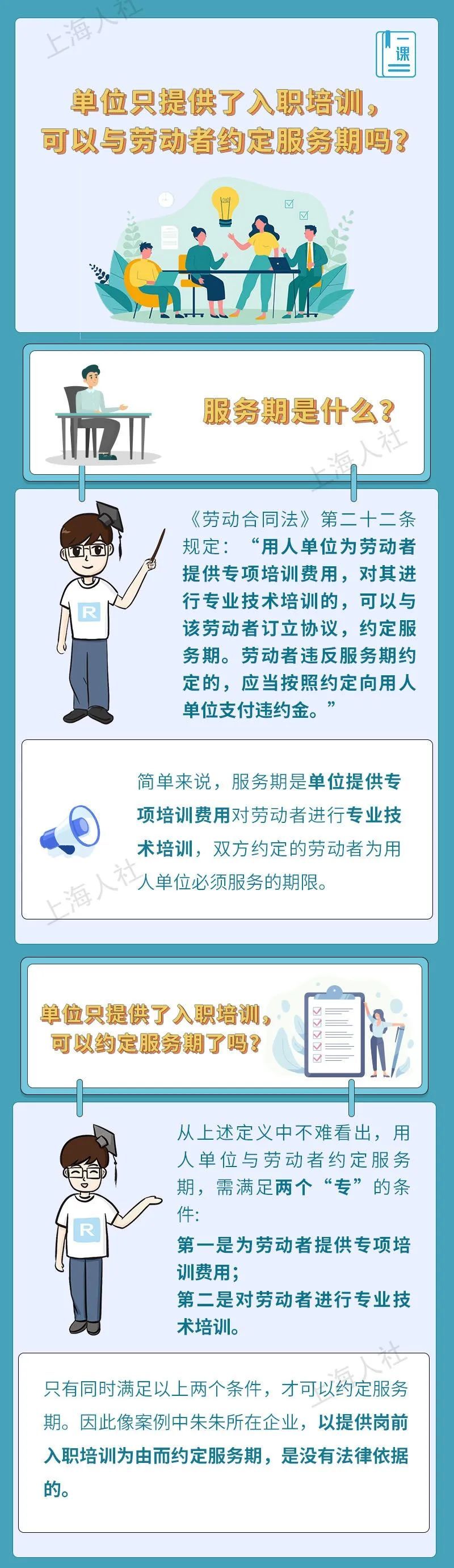 单位只提供了入职培训,可以与劳动者约定服务期吗?如何理解服务期约定中的“专项培训费用”和“专业技术培训”?约定服务期时,单位提出的违约金可以随意定吗?尚在服务期,劳动者提出解除劳动合同,一定要支付违约金吗……关于服务期的这些问题,来看市人社局的解答↓ 1、单位只提供了入职培训,可以与劳动者约定服务期吗? 朱朱本月初入职一家日化企业,从事销售工作。双方约定3年期劳动合同,签订时,单位提出,朱朱要先参加为期1个月的入职培训。根据公司规定,凡是参加入职培训的,公司都将与其约定2年的服务期。朱朱只听说过劳动合同期,“服务期”又是什么?公司这样约定有没有问题?马上来解答。 2、如何理解服务期约定中的“专项培训费用”和“专业技术培训”? 萧先生8月入职一家科技企业,担任产品经理,双方签订了3年劳动合同。近期,公司打算拿出一部分预算,面向全公司员工开展为期2个月的上岗操作业务培训,培训后,将与所有经理以上级别的员工约定3年服务期。萧先生对此提出异议,单位却说,只要单位出了钱,开展了培训,不就可以约定服务期吗?单位的说法对吗? 3、约定服务期时,单位提出的违约金可以随意定吗? 小周今年研究生毕业后入职了一家医药外企,从事研发工作,公司与他签订了5年的劳动合同。近期公司表示打算派他区海外总部参加为期3个月的专项技术培训,公司将出资包括培训费、差旅费等费用合计5万元,约定服务期5年,小周若在服务期内辞职的,应向公司支付违约金15万元。这服务期的违约金是可以随意定的吗? 4、尚在服务期,劳动者提出解除劳动合同,一定要支付违约金吗? 庞女士是某保险公司的精算师,公司曾在2019年7月派她到瑞士进行了半年的专业技术培训,并约定了5年的服务期及违约金。上个月,庞女士发现,公司今年以来一直没有为她缴纳社保,多次提出补缴,公司一直拖拉不办。最近,庞女士提出解约,公司表示解约可以,但她尚在服务期,因此要支付违约金。庞女士这种情况要支付违约金吗?