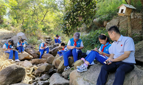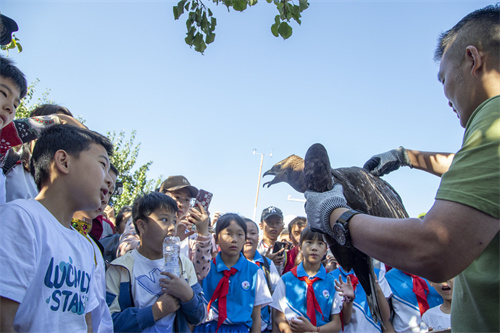 在城阳区野生动植物保护站,志愿者观看了近期因“鸟撞”受伤的蜂鹰、红隼、秧鸡等国家保护野生动物,夏庄街道源头小学的红领巾志愿林长开展了笔记大自然的实践活动,要把秋天留住。小水小学的红领巾志愿林长采集树叶雕刻出了国旗、中国地图、山河等图案向祖国献礼。