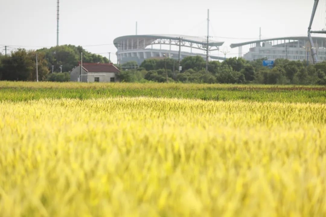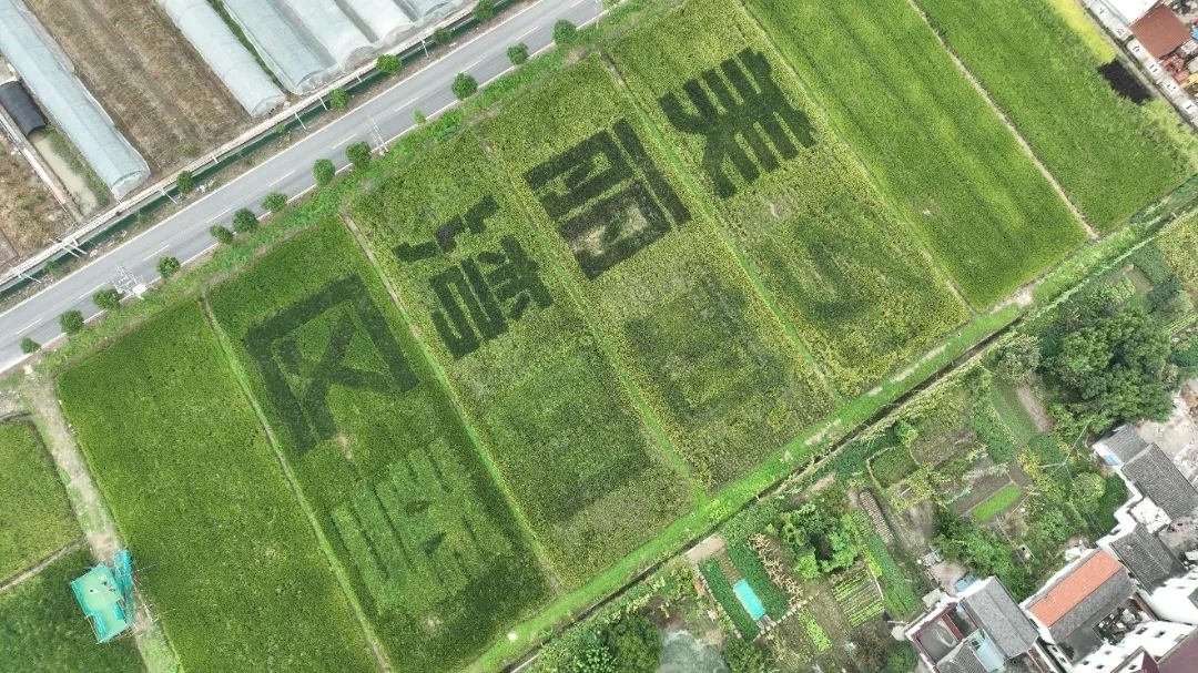 近日,在位于金山体育中心东侧、长兴村5069号时光田园的农田里,有一大片用彩色水稻打造的景观。随着水稻逐渐成熟,“美丽湾区 乡村四季”八字已经呈现。