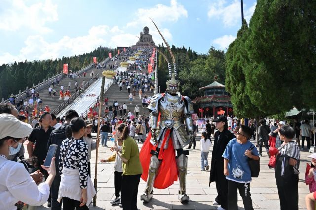 此外,国庆期间南山旅游景区还策划了一系列精彩纷呈的活动与表演,不仅有千手观音、大唐盛世舞蹈、民乐演奏、精彩舞龙、威风锣鼓等传统文艺演出吸引游客驻足观看,更有机甲孙悟空、西游记师徒四人、科学技术秀、卡通玩偶等深受小朋友们喜爱的内容,吸引众多游客互动拍照。