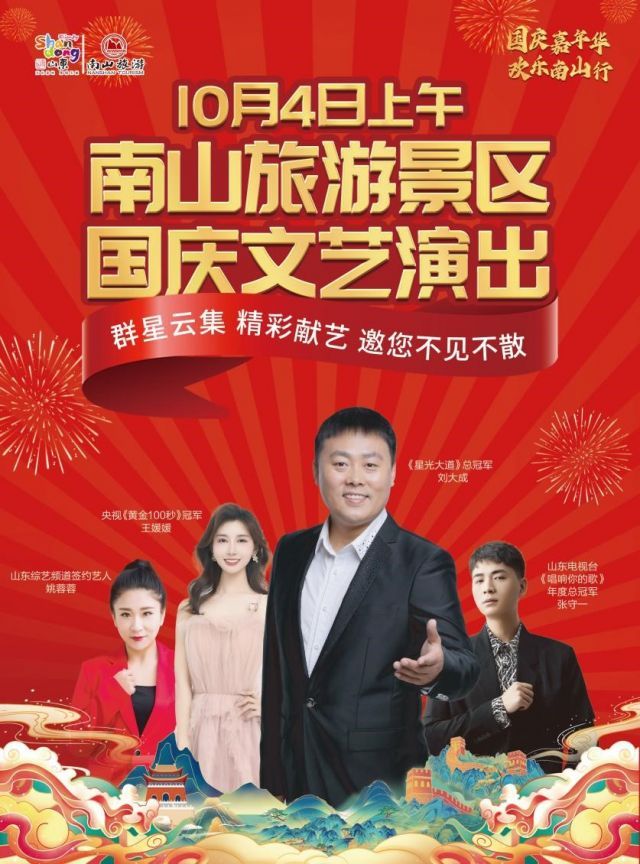 更加值得一提的是,10月4日上午,“国庆嘉年华 南山欢乐行”主题文艺演出将在南山景区精彩开启。中国内地知名男歌手、《星光大道》2010年度总冠军刘大成将携摇滚女歌手、山东广播电视台综艺频道签约艺人姚蓉蓉,山东电视台各大节目特邀歌手、央视《黄金100秒》冠军王媛媛,山东电视台《唱响你的歌》年度总冠军张守一等知名艺人联袂献艺,为大家带来一场艺术盛宴,现场更有奖品多多的抽奖环节带给观众连连惊喜,期待大家相聚盛会!
