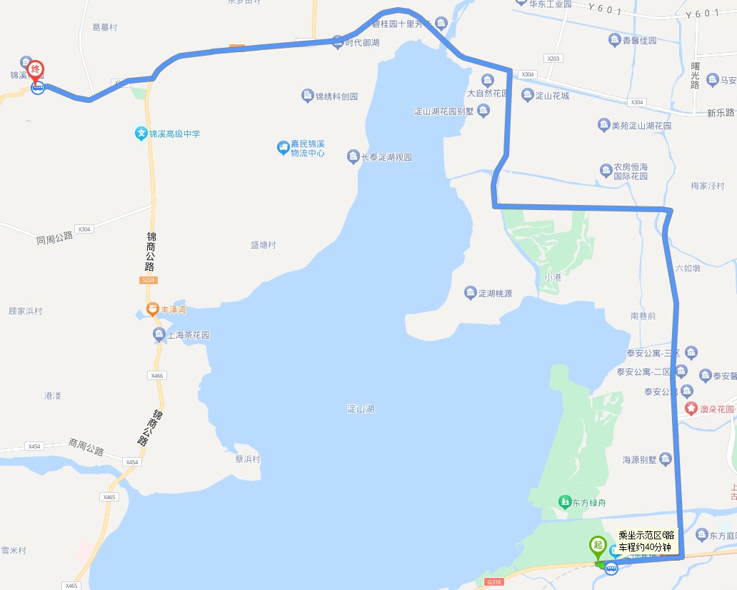 从沪青平公路山湾站步行至东方绿舟站,乘坐示范区6路抵达锦溪站,步行至锦溪古镇。
