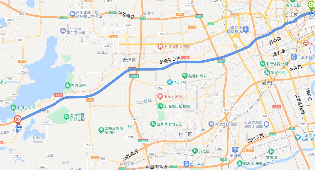 在沪青平公路培爱路站乘坐青金线或青金线(新池村)抵达沪青平公路山湾站。