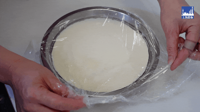 3. 化开的内脂粉倒入豆浆,撇去浮沫,包保鲜膜,静置15分钟。
