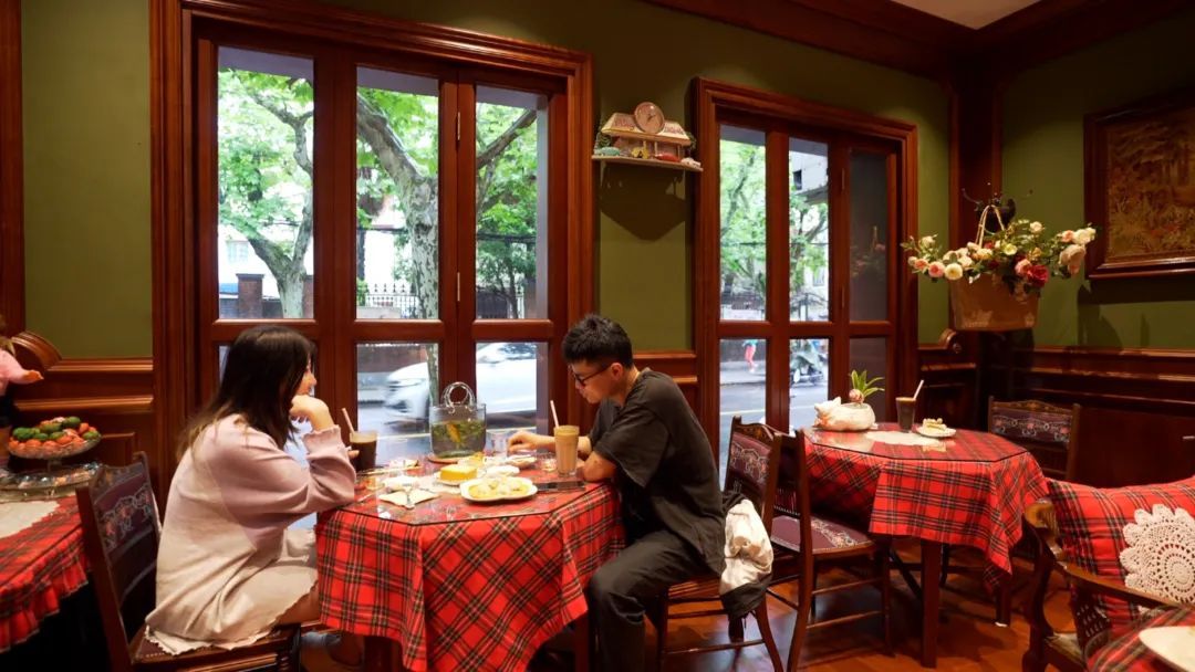 深色的原木桌椅、餐桌上铺着的红格桌布、可爱精致的娃娃和小摆设,还有鲜花和绿植、浓浓的海派复古风情让人眼花缭乱。放置在店堂一角的钢琴,静静地等待着与人合奏出最美的旋律。