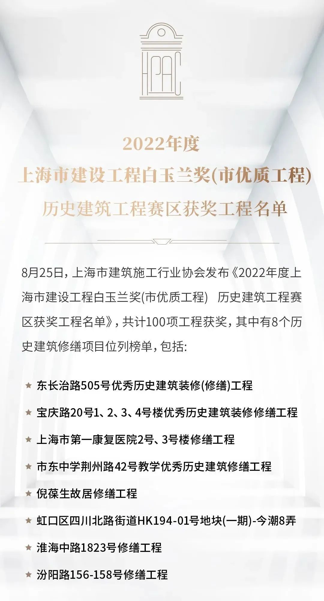 最近,上海市建筑施工行业协会发布了《2022年度上海市建设工程白玉兰市奖(市优质工程)历史建筑工程赛区获奖工程名单》,共计100项工程获奖。据了解,上海市建设工程白玉兰奖(市优质工程)是上海市建筑行业工程质量的最高荣誉奖,自创立之初就贯彻执行党和国家一贯倡导的“百年大计、质量第一”的方针,坚持“质量兴业”的宗旨,促进建筑施工企业增强质量意识,具有权威强、标准高、要求严的特点。日前,2022年度上海市白玉兰奖出炉!在八大获奖历史建筑工程中,虹口区的原雷士德工学院修缮工程、公益坊(现今潮8弄)榜上有名。