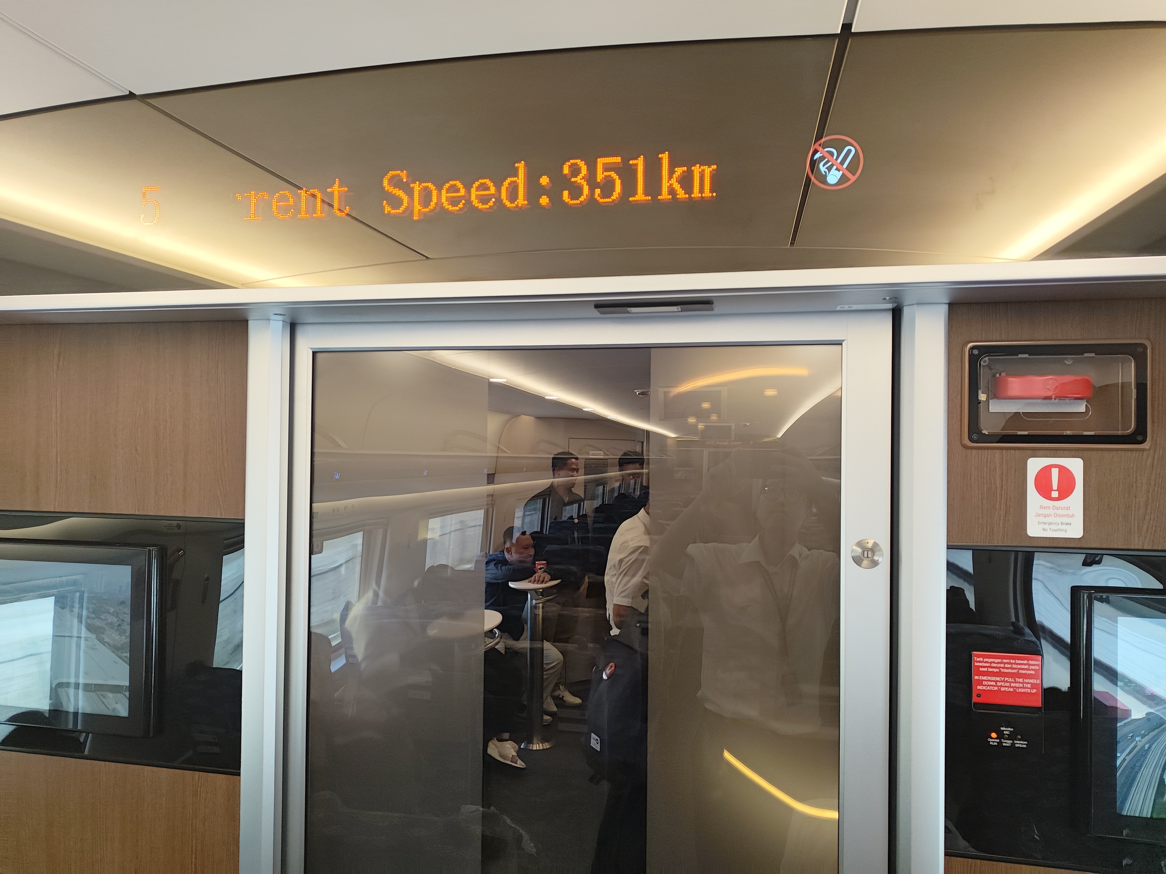 雅万高铁动车组最高运营时速350公里,是世界商业运营速度最高的高铁列车之一。每列动车组编组8辆,设VIP、一等、二等座席,总定员601人,可重联运行。