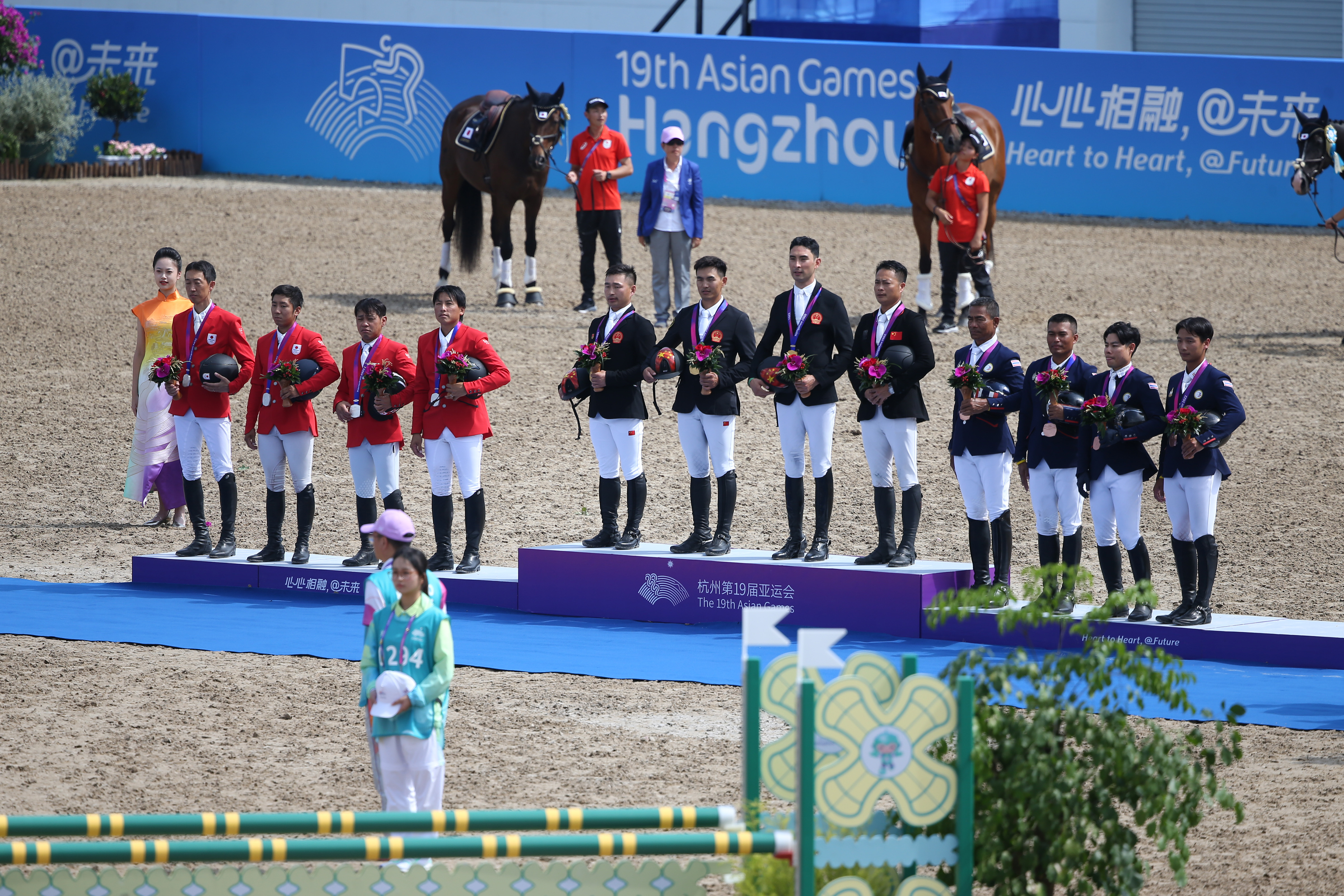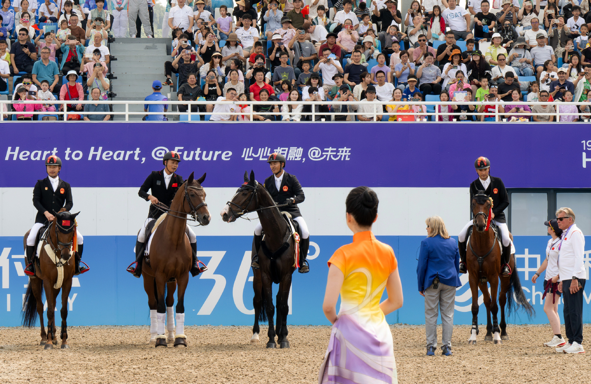 马术这枚亚运团体金牌,对于中国队来说,等了太久了。1982年新德里亚运会,马术项目成为正式比赛项目。此后40多年里,亚运会马术赛场产生过52枚金牌,共有10个国家及地区获得过金牌,但中国马术队始终没能站在最高领奖台上。2002年釜山亚运会,中国马术盛装舞步队获得季军;2010年广州亚运会,中国马术队在盛装舞步和三项团体赛中两夺铜牌;在前两届亚运会中,华天代表中国马术队获得三项赛个人赛亚军和季军。在杭州,中国马术队许久以来的梦想,终于得以实现。