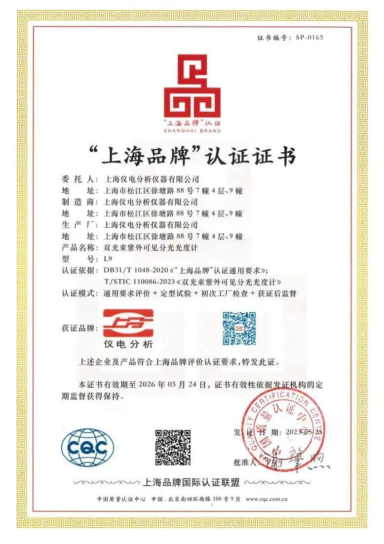 松江企业上海仪电分析仪器有限公司日前收到喜报——其“双光束紫外可见分光光度计(L9)”通过“上海品牌”认证。据悉,这是松江今年第4家获得该认证的企业。