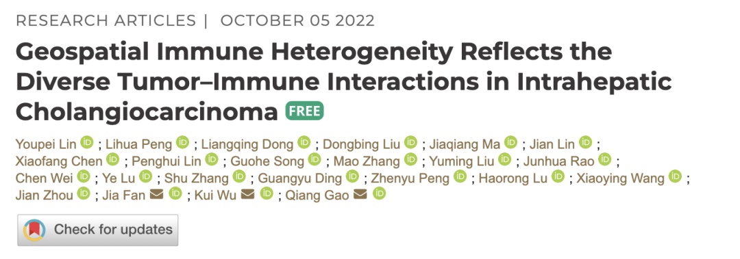 在这一研究的基础上,林友培进一步研究了肝内胆管癌在发生发展过程中与免疫环境的相互作用规律,补充了目前的肿瘤免疫编辑理论,并针对不同的肿瘤免疫分型提出了不同的联合治疗策略。根据这一成果,他以第一作者身份在重要国际期刊 Cancer Discovery 发表了论文Geospatial Immune Heterogeneity Reflects the Diverse Tumor-Immune Interactions in Intrahepatic Cholangiocarcinoma。