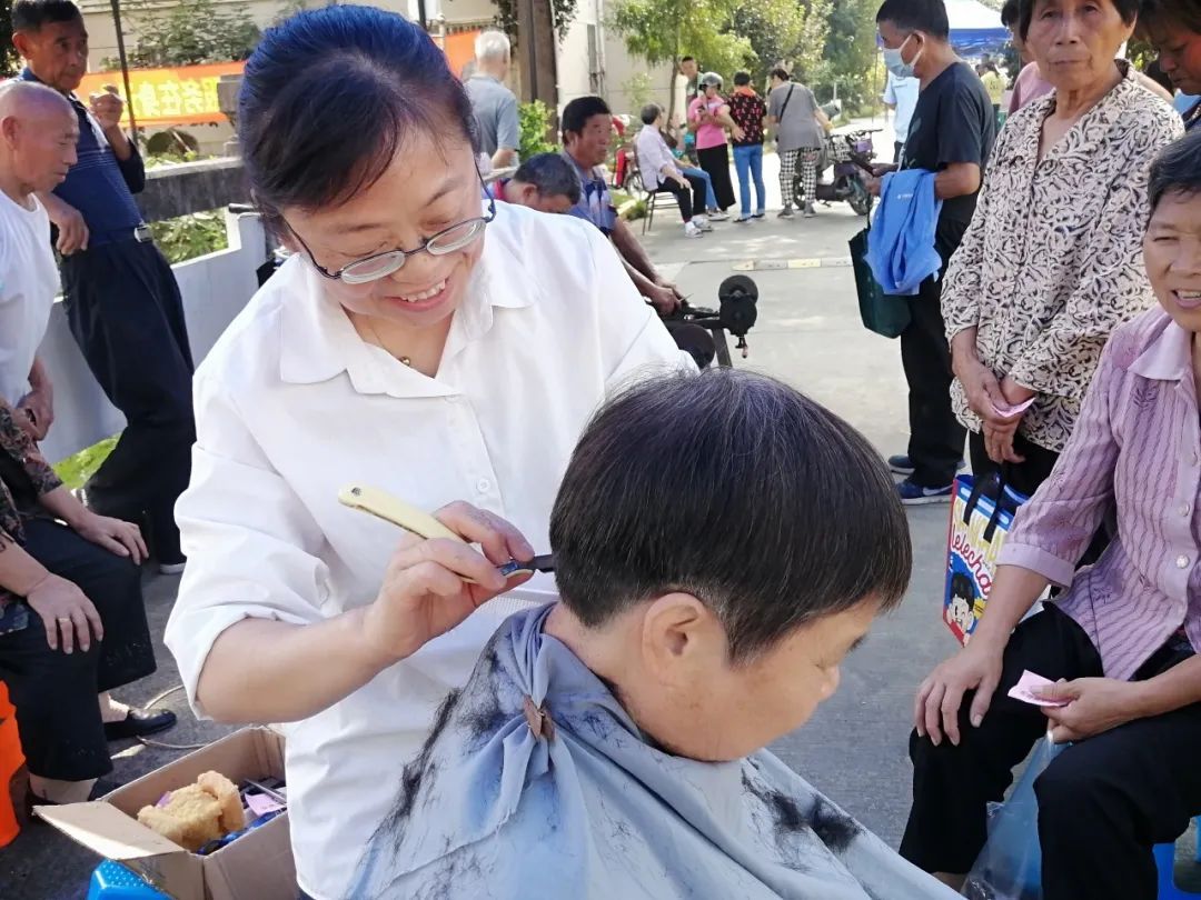 磨刀摊位前人虽不多,但一把把菜刀剪刀已排起了“长队”,居民志愿者细心地给每把刀具贴上小纸片,避免混淆,而它们的主人则坐在不远处的理发摊位排队。“我一边理发一边等,一举两得,等我头发理完,这菜刀也差不多磨好了。”居民郁文兰说道。