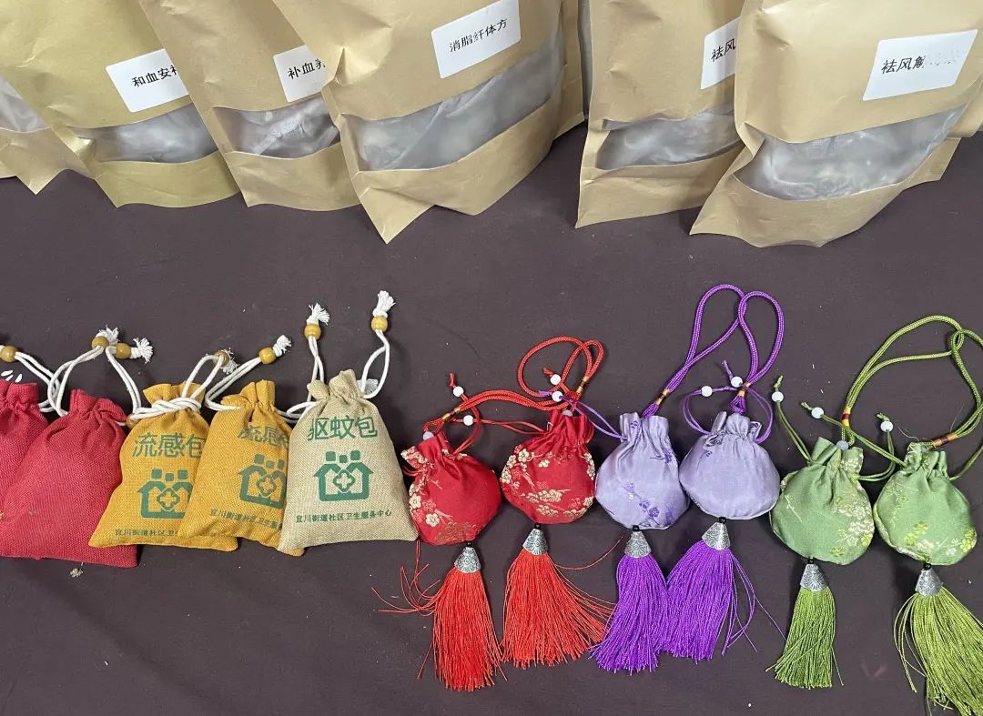 最近天气变冷,早晚温差比较大,流感易发。宜四站点根据“草药调脾胃,海派新传承”的理念,推出了流感包、防感包(藿香、紫苏、佩兰、薄荷、防风等)、护心包(红花、丹参、川芎、艾叶等)等特色精美香囊。居民们可以在将香囊挂在家中客厅,也可以随身携带。“我们还为居民朋友们提供中医药茶饮包和足浴包,比如针对血脂高、肥胖、抵抗力差我们推出了祛风解毒茶、和血安神茶、补血养颜茶、消脂纤体茶等。”顾医生介绍道,祛湿足浴包可以帮助大家缓解下肢寒冷等症状,居民们可以每周配一些居家使用。