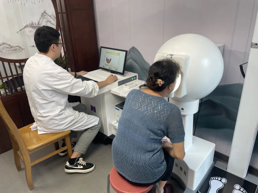 记者在服务站内还发现了一台“黑科技”——“中医四诊仪”,让“望闻问切”也智能化起来。受检者只需要坐在椅子上对着这台“黑科技”伸吐舌头,让电子腕带搭脉,“中医四诊仪”通过采集舌象、面色、脉象、症状等四诊数字化信息,几分钟内就可以生成一份个体化的健康状态分析及养生方案。“中医四诊仪”诊断后,医生会根据解读方案为受检者提供调治方案。