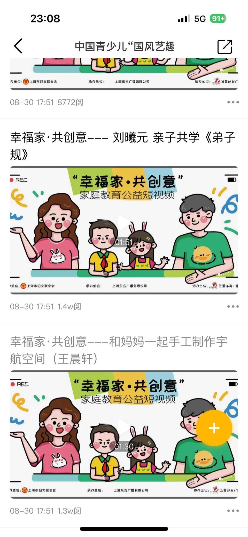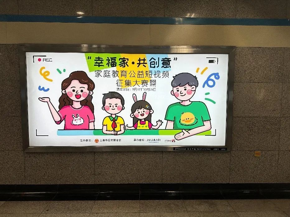 活动的地铁灯箱广告 据了解,该活动由上海市妇女联合会主办,上海人民广播电台五星体育广播承办,国风艺趣项目组协办。上海人民广播电台五星体育广播青少儿项目负责人沈奇洁介绍称:“从9月初启动至今,不到1个月的时间,我们已收到了110件短视频作品,上海人民广播电台官方阿基米德平台上的相关作品总浏览量已突破66万,且仍在不断增长。” 从地铁站宣传大屏和五星体育广播里得知“幸福家•共创意”的活动消息后,沪上家庭便纷纷跃跃欲试,用奇思妙想的形式创作出了异彩纷呈的短视频作品。 “都说青少年和父母之间有代沟,殷俊,你觉得我们家有这个问题吗?”“我觉得没有,因为我们全家一起运动的家庭氛围超棒,我们总有聊不完的话题。”视频里,上海市延安初级中学学生殷俊和妈妈以对谈的形式生动讲述了亲子运动的快乐。殷俊妈妈表示:“亲子运动是家庭教育的法宝,它不仅能强健体魄,还能缓解孩子的学习压力,在训练和比拼中,我和孩子自然而然就成为了相互鼓励、共同进步的战友。” “今年暑假,在贵州凉井希望小学,妈妈负责上音乐课,我负责教学生打小军鼓,介绍扯铃知识。放学后,我们到留守儿童的家里,给他们送来了从上海带来的礼物,还帮他们做了一顿饭……”上海市卢湾中学学生武沂在视频里生动地记录了和妈妈一起支教的故事。实际上,武沂融妈妈的支教行动已坚持了多年,这种公益精神也潜移默化地感染着孩子。在她看来,将“小爱”变成“大爱”,把小家庭的温暖和能量传递到更多的地方,便是一次有意义的家庭教育。