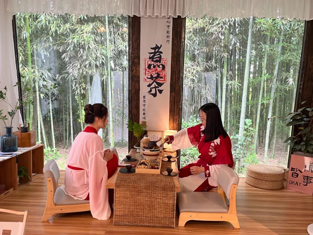 如果不喝酒、也不喝咖啡的朋友来到这里,那么可以选择在田心茶事围炉煮茶。约几个好友,边喝茶边聊天,在久违的惬意和放松之间,不知不觉小半天就过去了……女孩子也可以现场借一套汉服或马面裙,在优雅森系的景致中,留下美美的照片,一定会让你在朋友圈“出圈”。