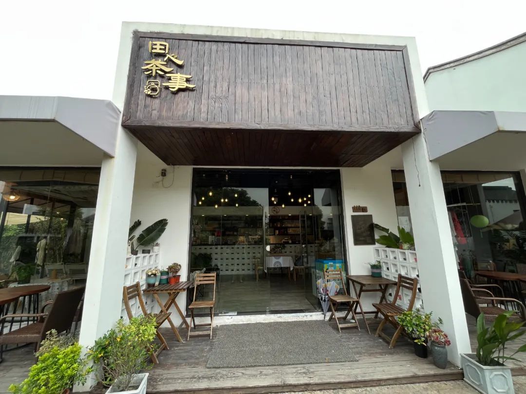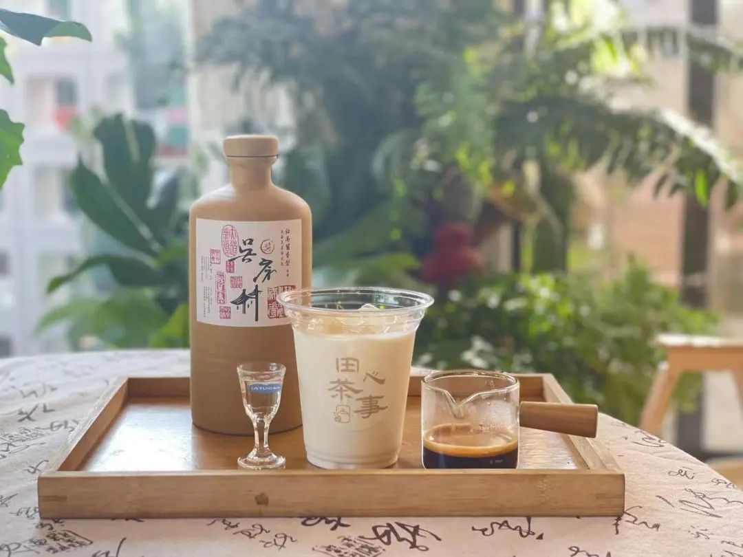 在吴房村田心茶事,你可以品尝到这一杯酱香拿铁;在对面的田心桃里乡野餐厅,还能品尝到“吴房村酒”。