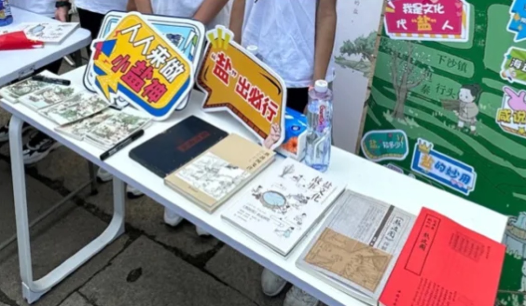 “小朋友,你知道这里为什么叫新场吗?”“你知道《熬波图》这本古书吗?”“你知道浦东为什么有地名叫大团、三灶、六灶吗?”几位南模文化传承梦之队的队友,不仅设摊展示传播盐文化,而且,在游客如织的新场古镇大街和徐家汇公园,针对前来游玩的游客,进行启发提问式的盐文化科普活动。
