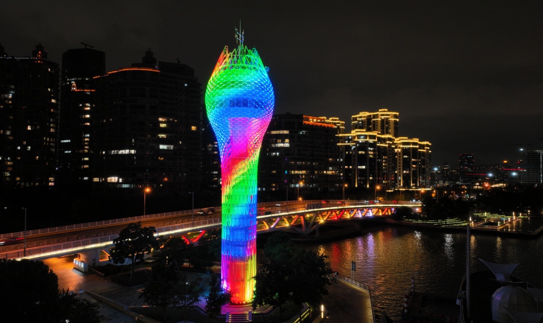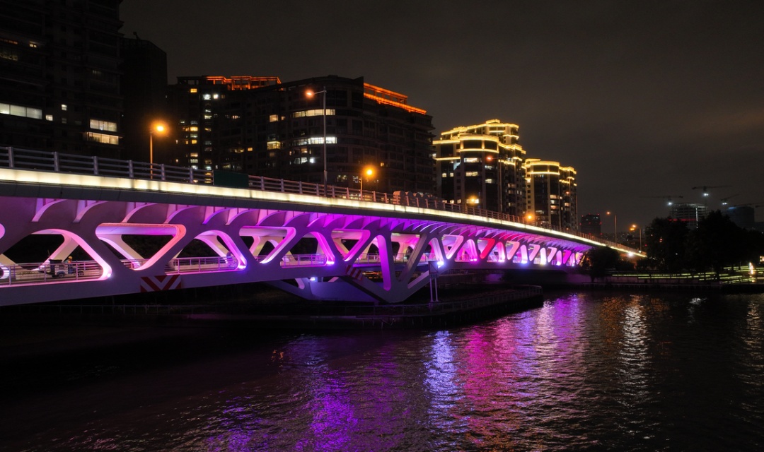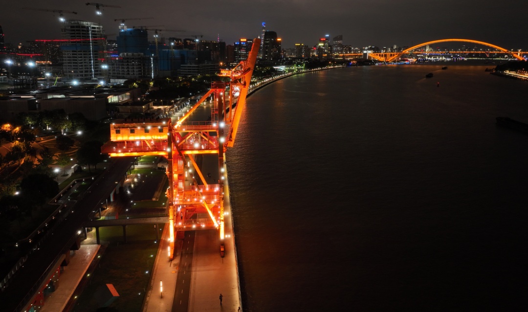 徐汇滨江的夜景则以科技与艺术相结合,海事塔换上了国庆红、暖黄、碧蓝、翠绿等灯光装扮,远处的两座橘色塔吊熠熠生辉。龙腾大道路桥在变换灯光的映照下犹如一条巨龙卧于江面,西岸智塔灯光配合周边楼宇共同“闪耀”,为市民带来了视觉上的“饕餮盛宴”。